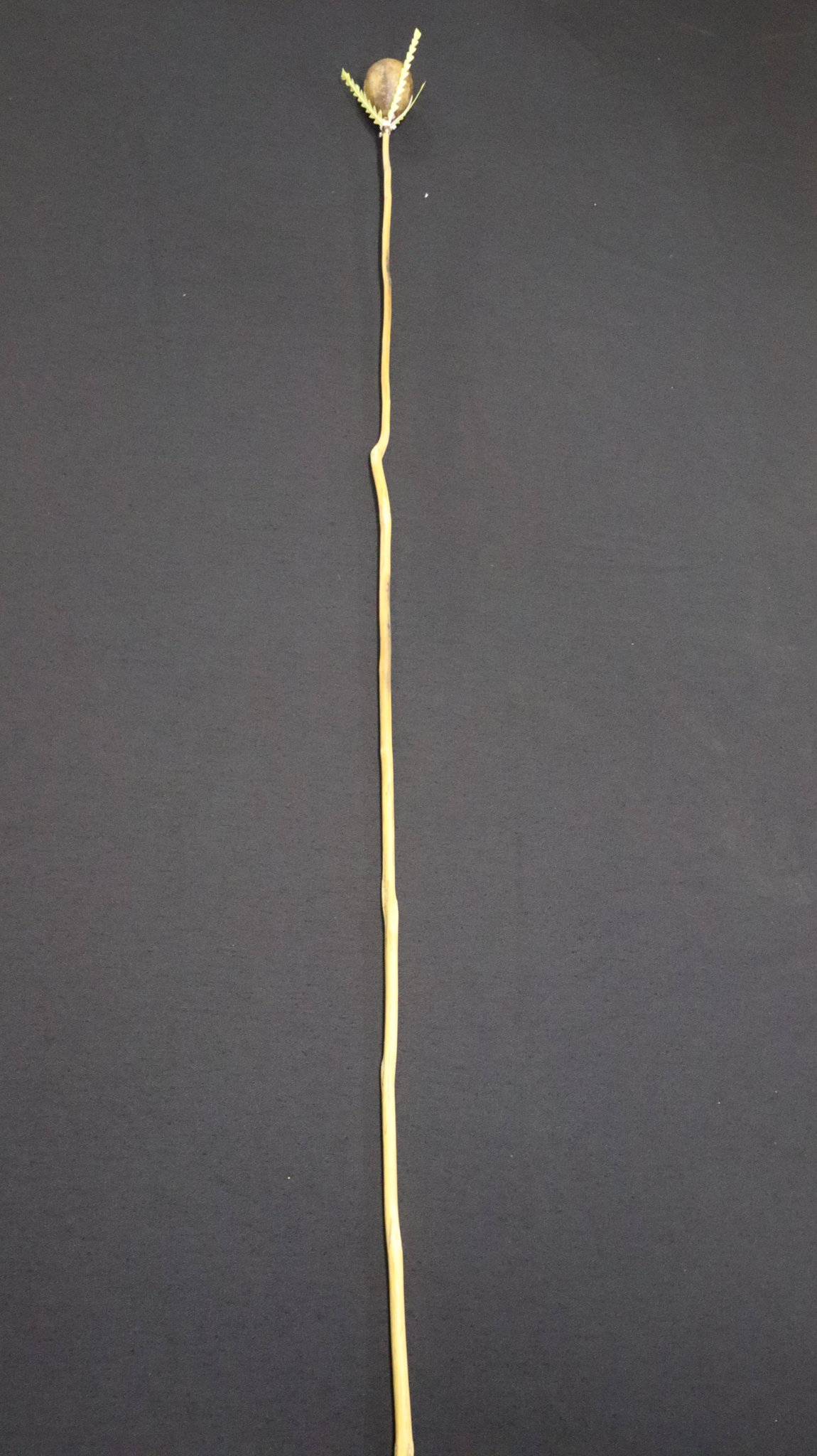 Chocalho de vara confeccionado com recipiente de cuia presa a vara de madeira de miraúba que serve de cabo. Apresenta na base da cuia, ao seu redor, penas de arara e garça recortadas com marca dente d’água. Possui sobre a cuia penas de garça e arara amarradas e coladas com cera de abelha. Exibe na extensão da vara, próximo a cuia, tecido industrializado vermelho.