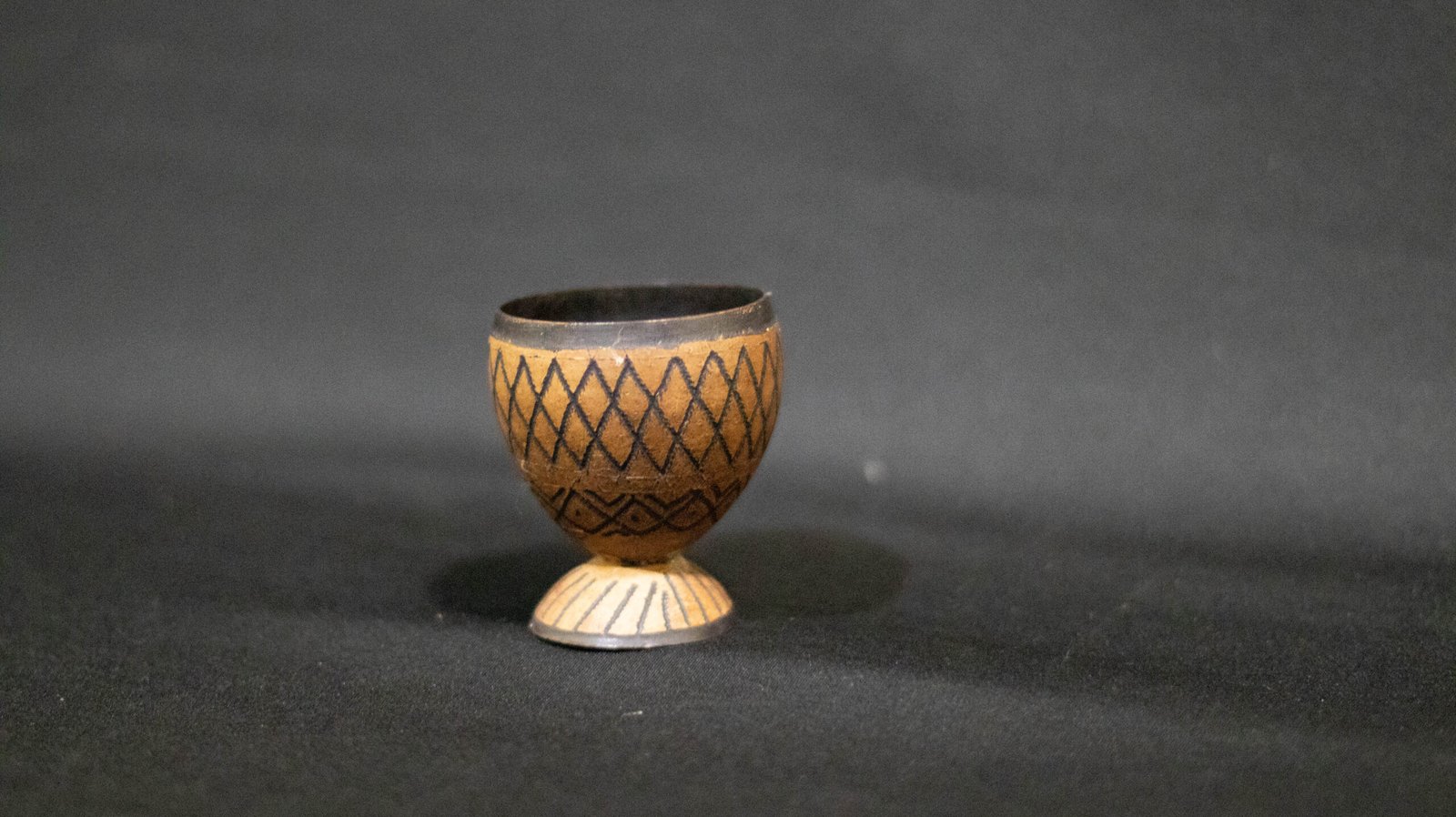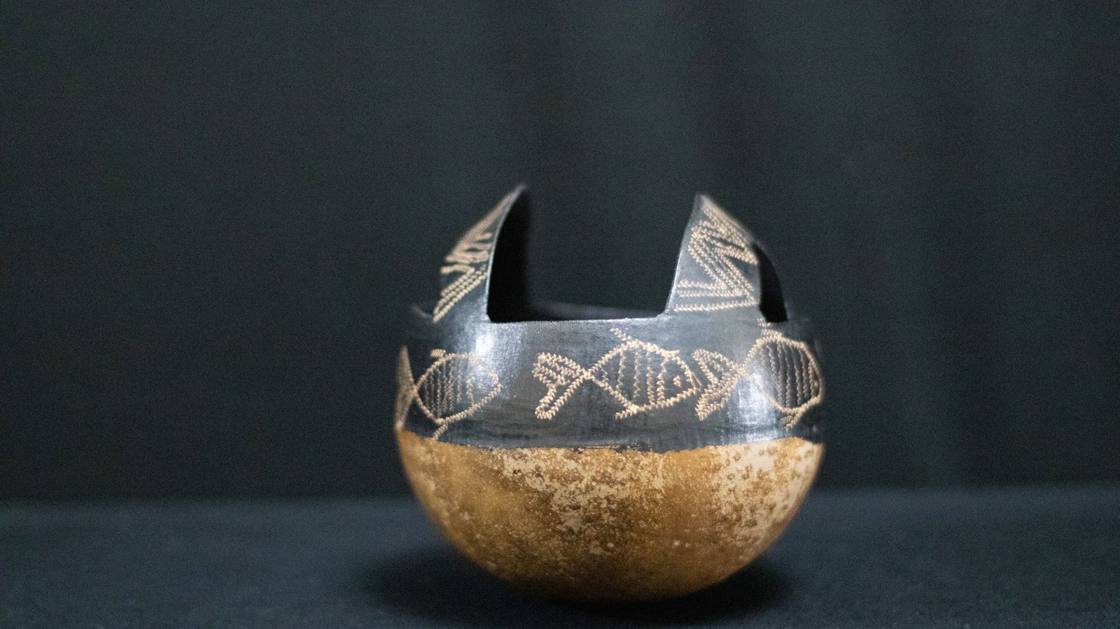 Cuia confeccionada com o fruto maduro da cuieira cortado ao meio. Apresenta parte interna tingida de preto e externa com listra preta, listra dãdelo, garça, peixe, folha, árvore e o nome waka.