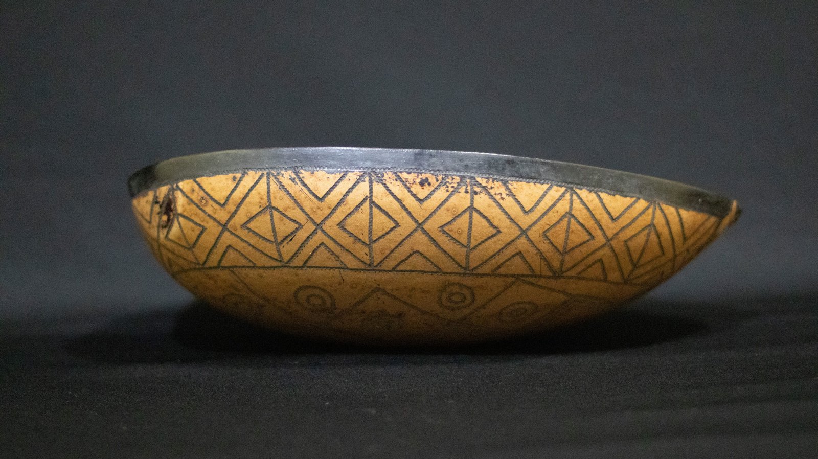 Cuia confeccionada com o fruto maduro da cuieira cortado ao meio. Apresenta parte interna tingida de preto e externa com listra preta, kuahí pequeno e dãdelo pequeno.