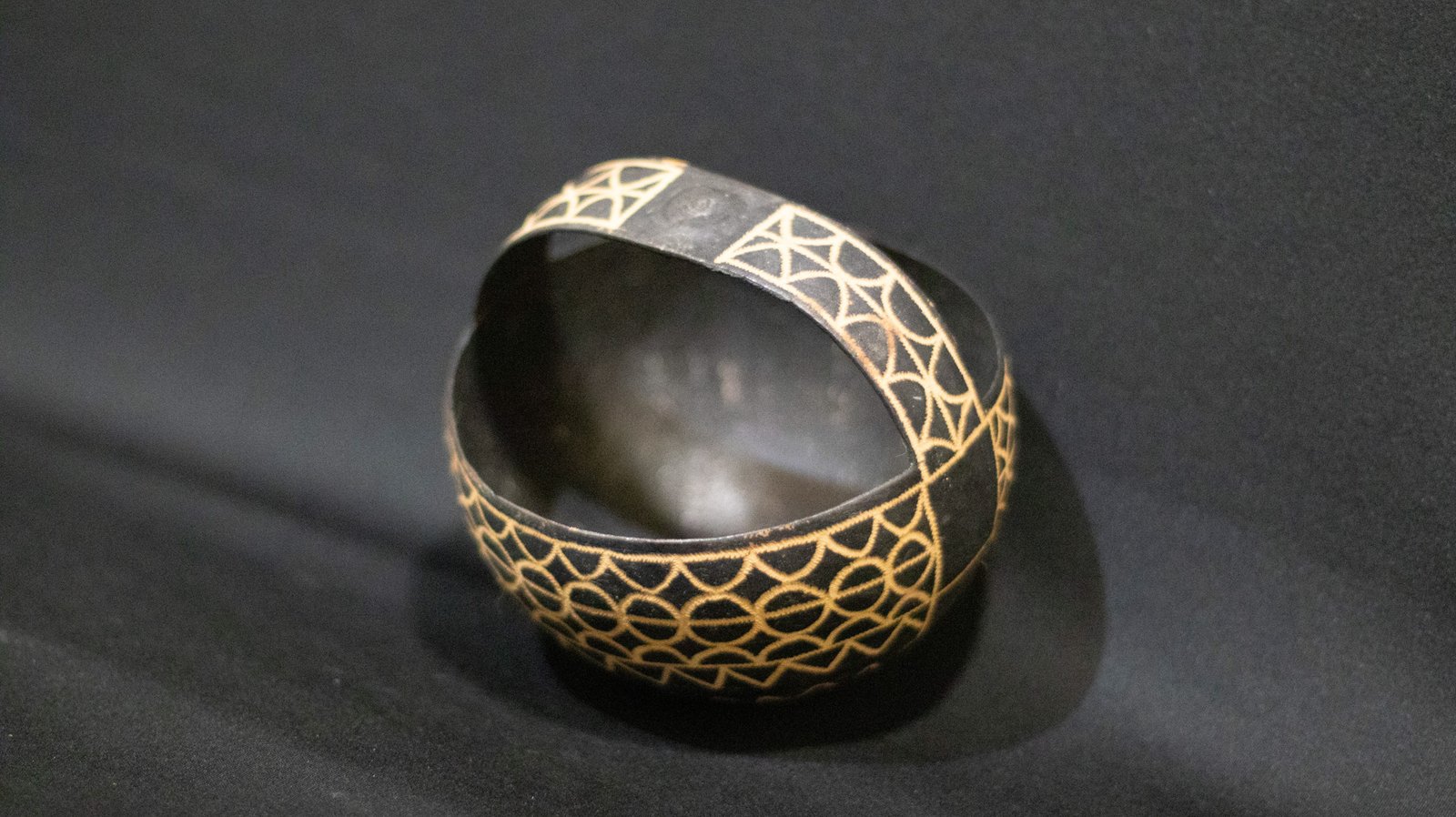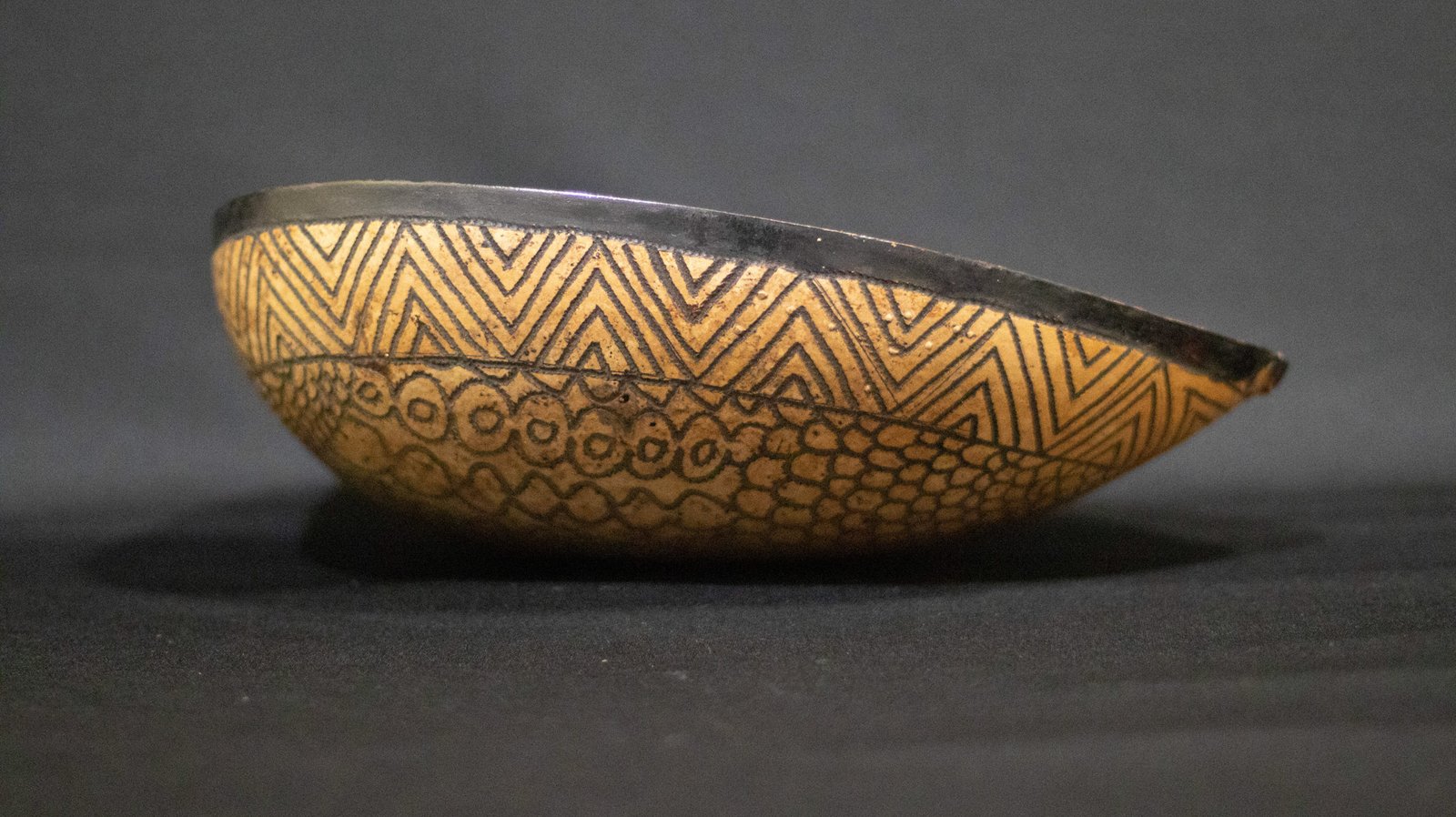 Cuia cortada no meio, raspada por dentro, pintada com tinta de kumatê (tira-se a casca de pau bate bem e põe para ferver até ficar preto e grosso, deixa esfriar e pinta a cuia) depois de pintada é colocada em cima da cinza com xixi para que ela fique bem preta e brilhosa.
