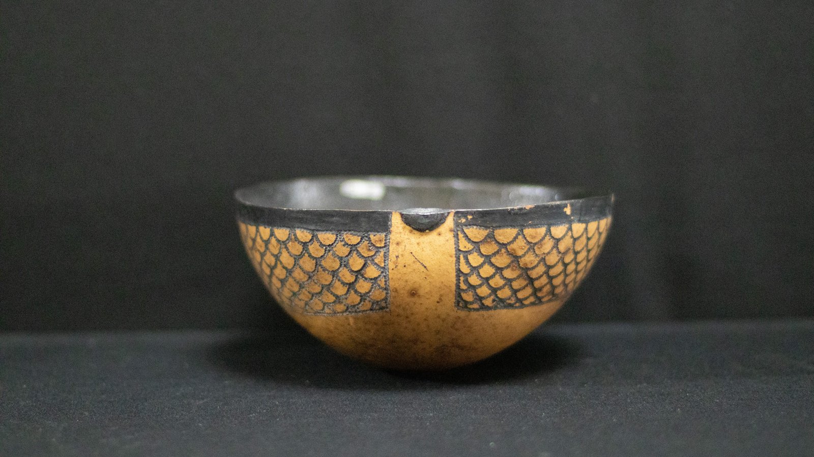 Cuia cortada no meio, raspada por dentro, pintada com tinta de kumatê (tira-se a casca de pau bate bem e põe para ferver até ficar preto e grosso, deixa esfriar e pinta a cuia) depois de pintada é colocada em cima da cinza com xixi para que ela fique bem preta e brilhosa.