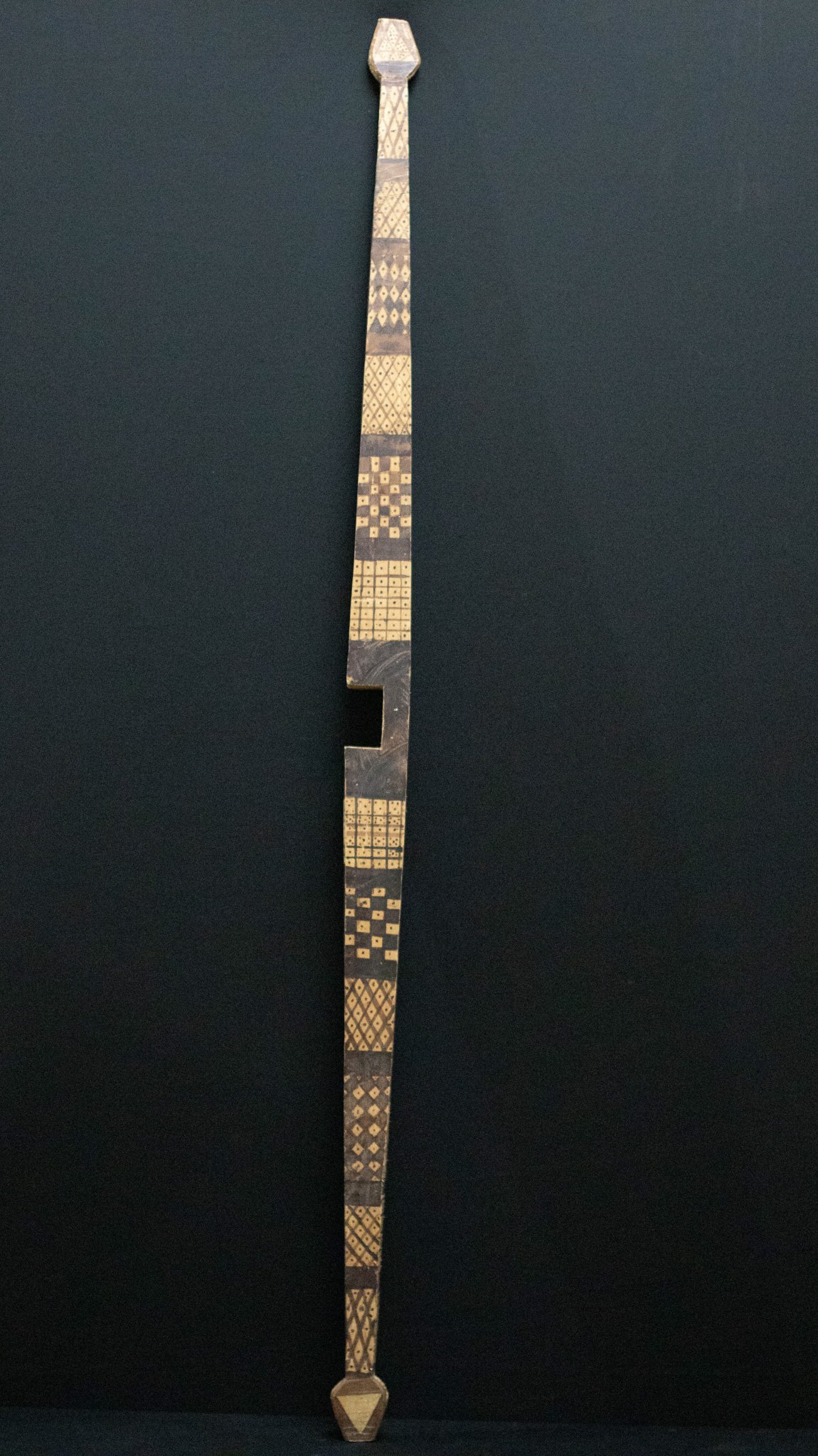 Mastro constituído com três estacas de madeira não identificada, sendo uma aparelhadas como paralelogramas e as demais entralhadas com forma sinuosa e montadas em forma de cruz. Apresenta a estaca vertical decorada com marca kuahí, dente d’água (dãdelo/patuá) nas cores azul, preto e vermelho e as estacas horizontais decoradas com pontos multicoloridos. Possui nas extremidades das estacas tufos de algodão.