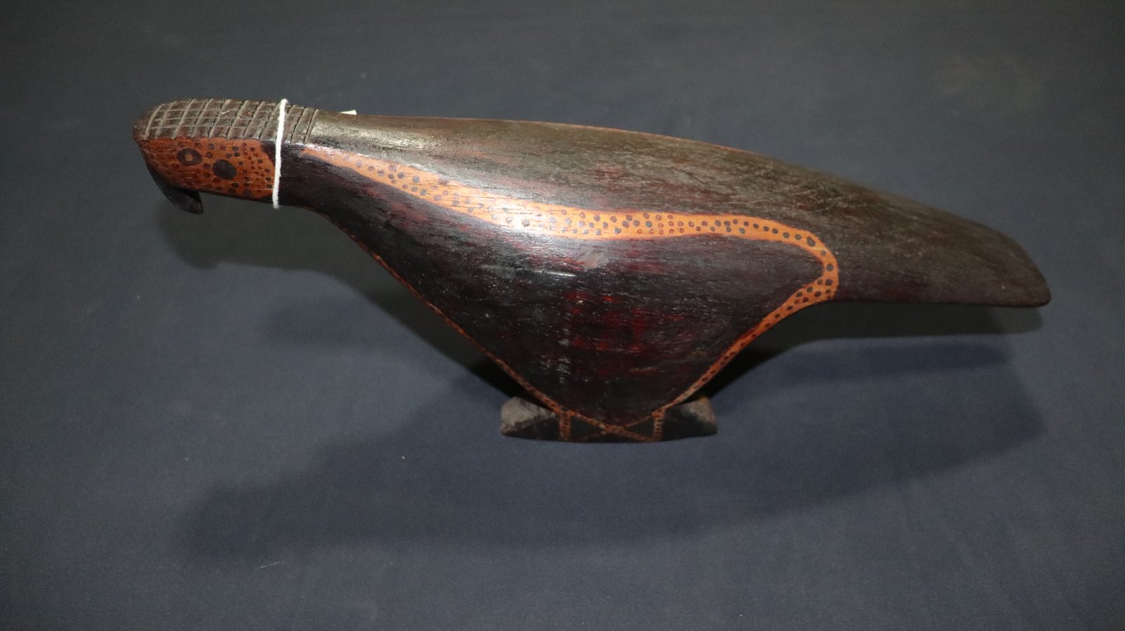 Escultura de madeira representando Kayeb (uma das constelações mais importantes do povo Palikur), confeccionada em madeira caju constituída de cauda, corpo alongado provido de duas cabeças, separadas por uma cauda. Apresenta em cada lateral cinco esculturas de estrelas e superfície decorada com marcas de Kuahí, makoko e estrelas pintados com com tinta de urucum e cumatê .