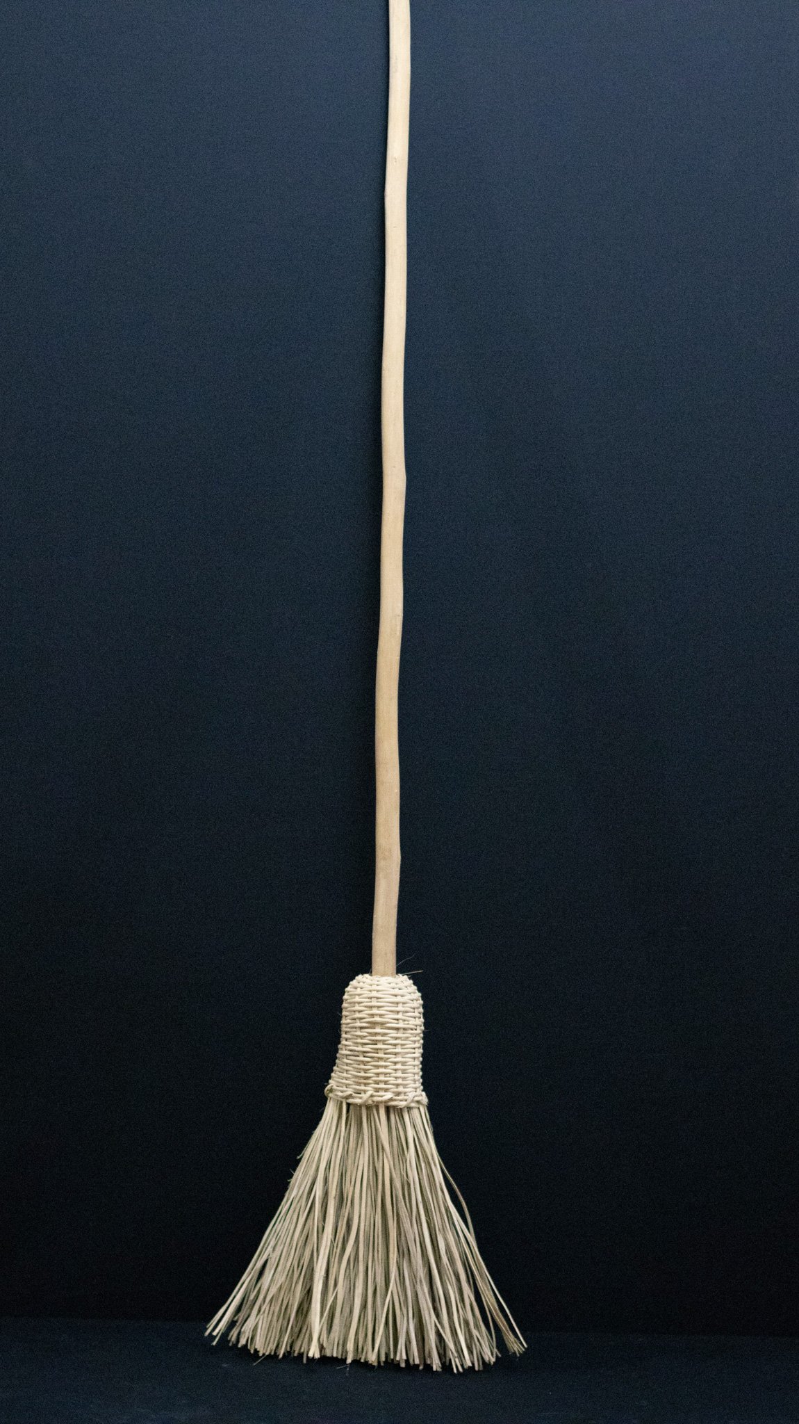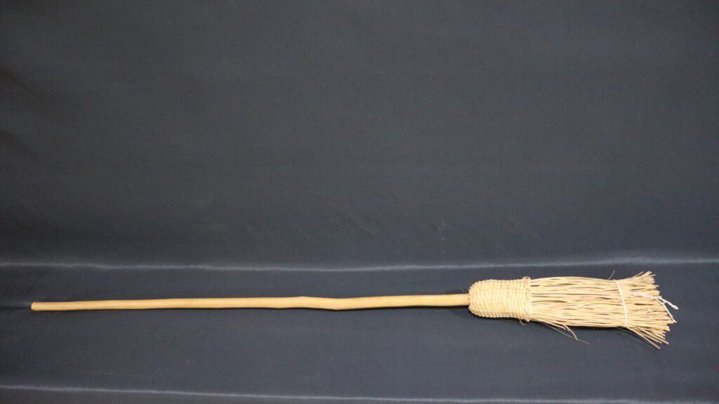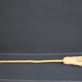 Vassoura constituída de cabo de madeira roliça não identificada e cerdas de cipó não identificado. Apresenta as cerdas unidas por meio de campona trançada de cipó não identificado, segundo a técnica do quadricular gradeado.