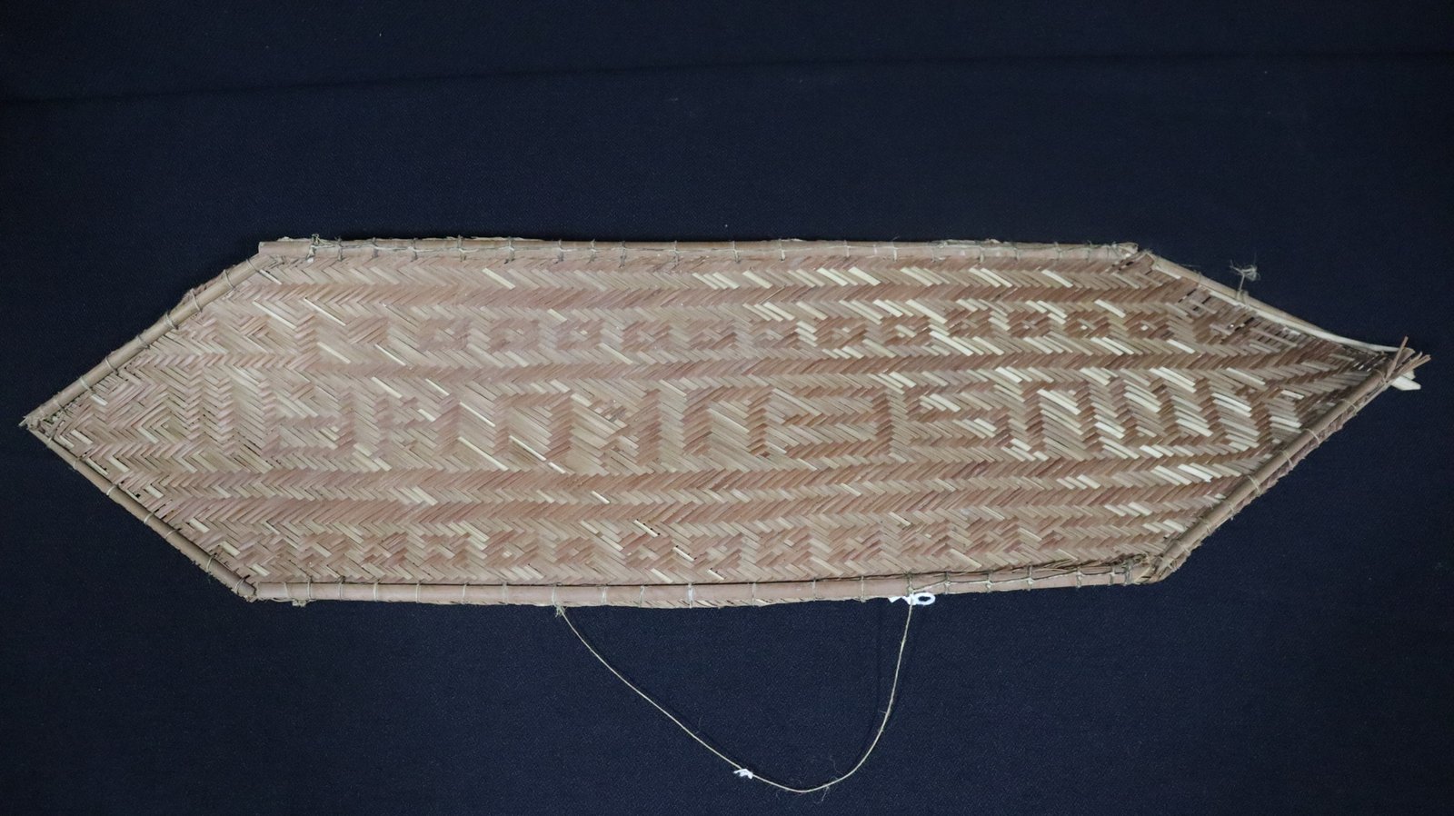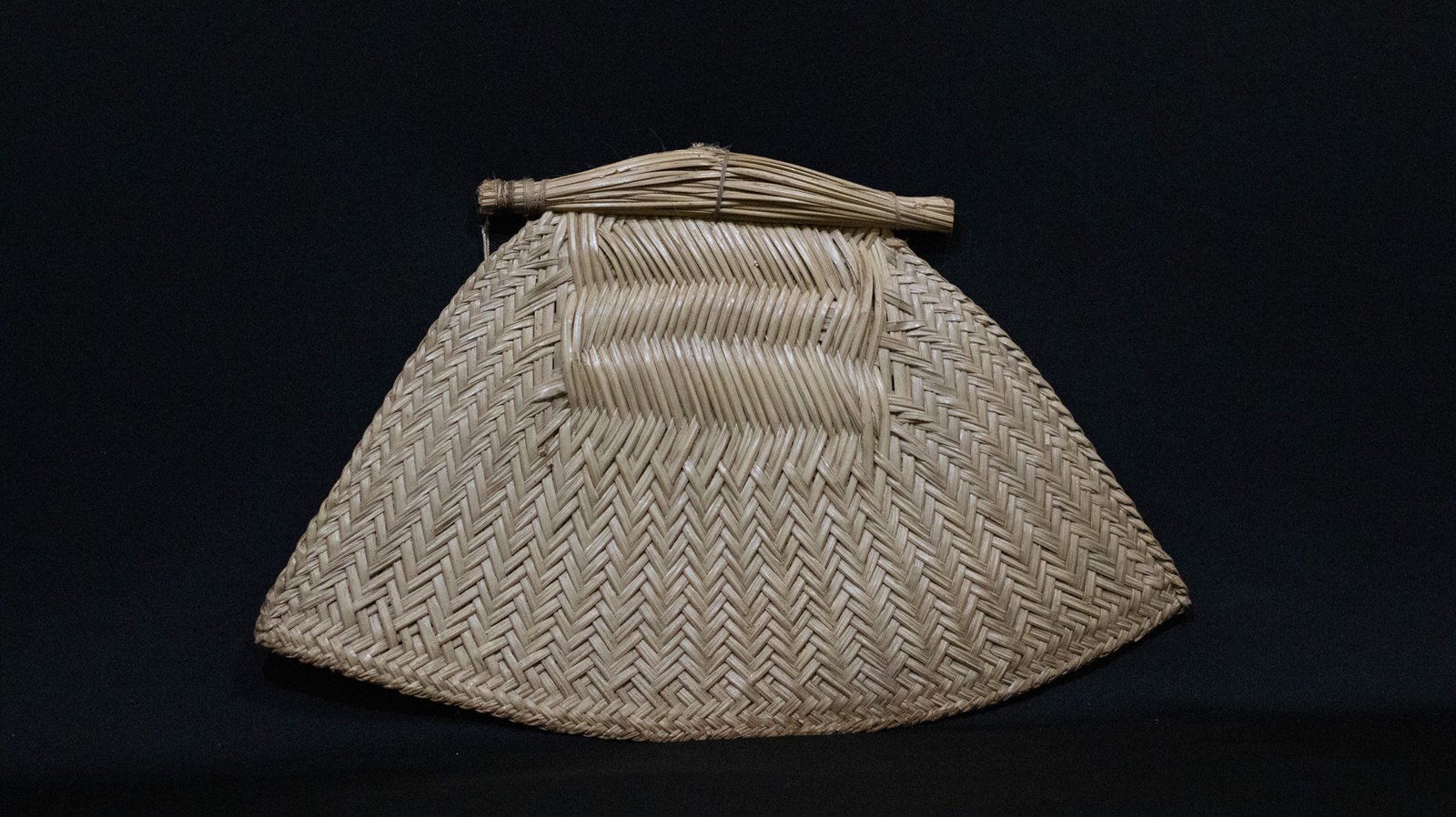 Abano trançado de conformação trapezoidal, confeccionado com tala de tucumã, segundo a técnica do sarjado, criando motivo espinha de peixe. Apresenta a base reforçada para empalmar.