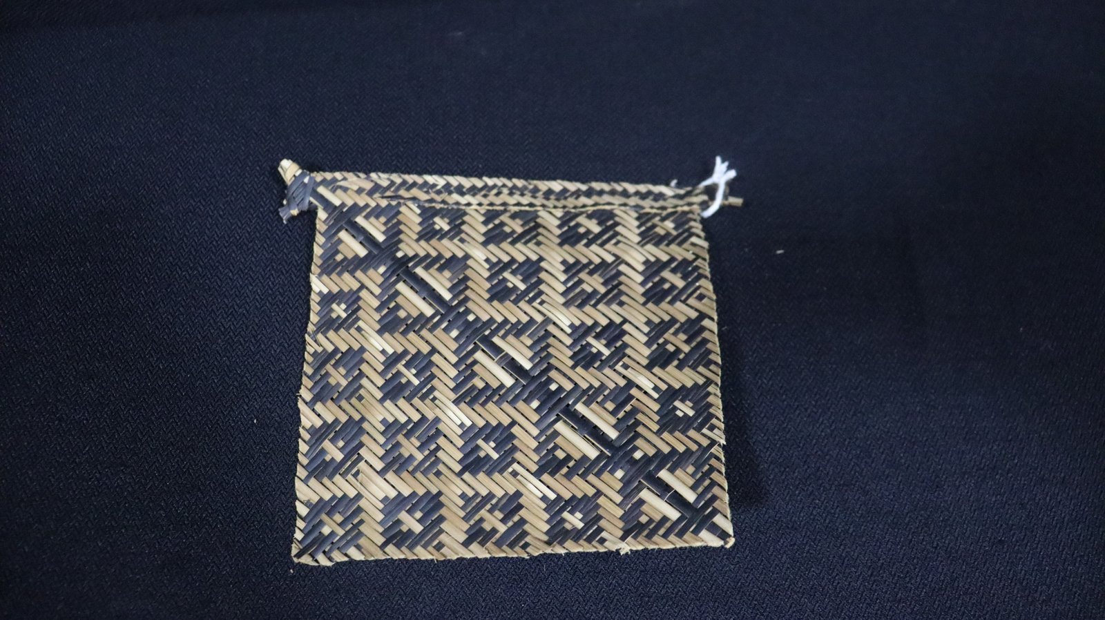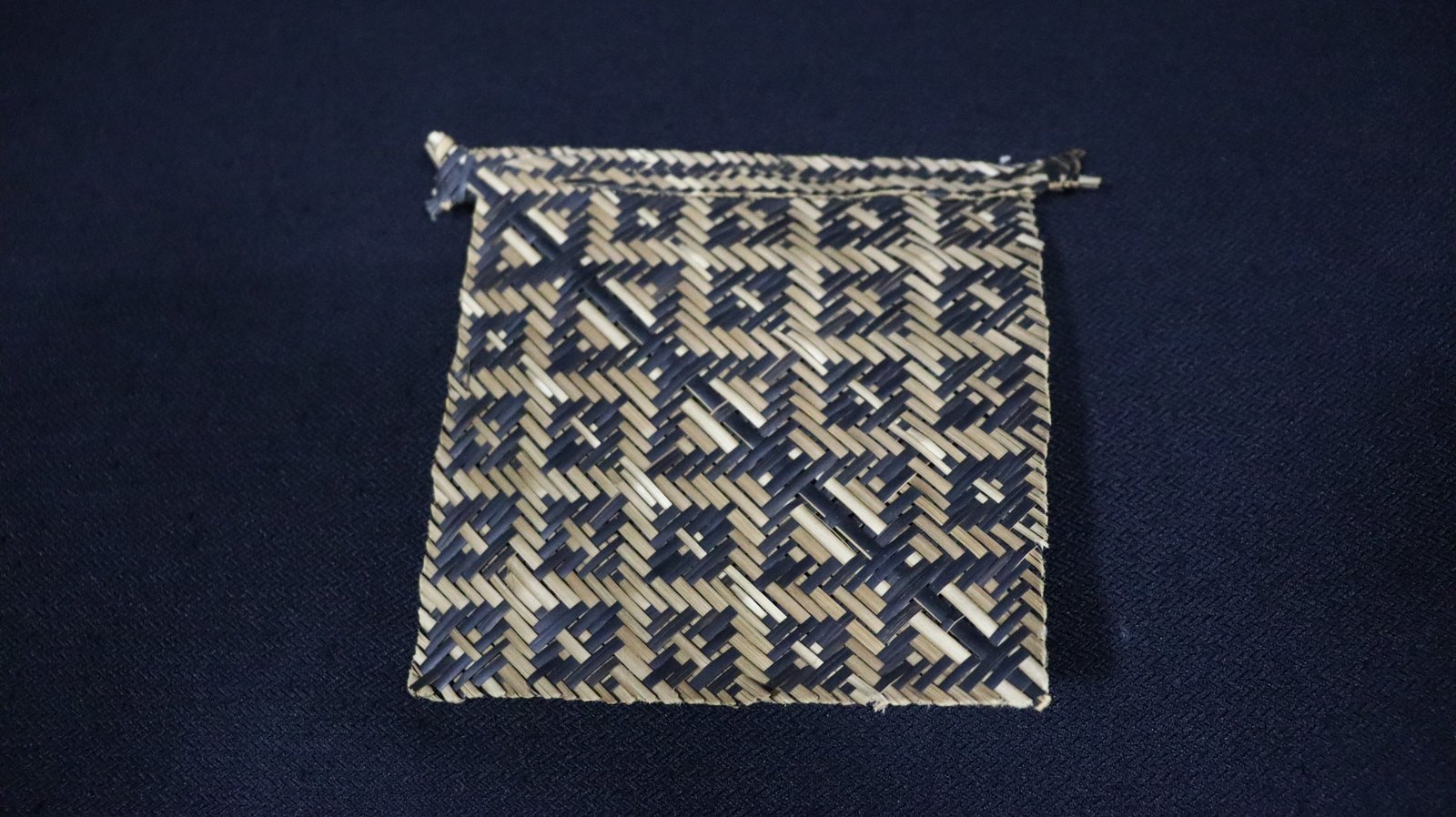 Abano trançado de conformação quadrangular, confeccionado com tala de gurarumã, segundo a técnica do sarjado, criando motivo geométricos na superfície não identificado. Apresenta a base reforçada para empalmar.