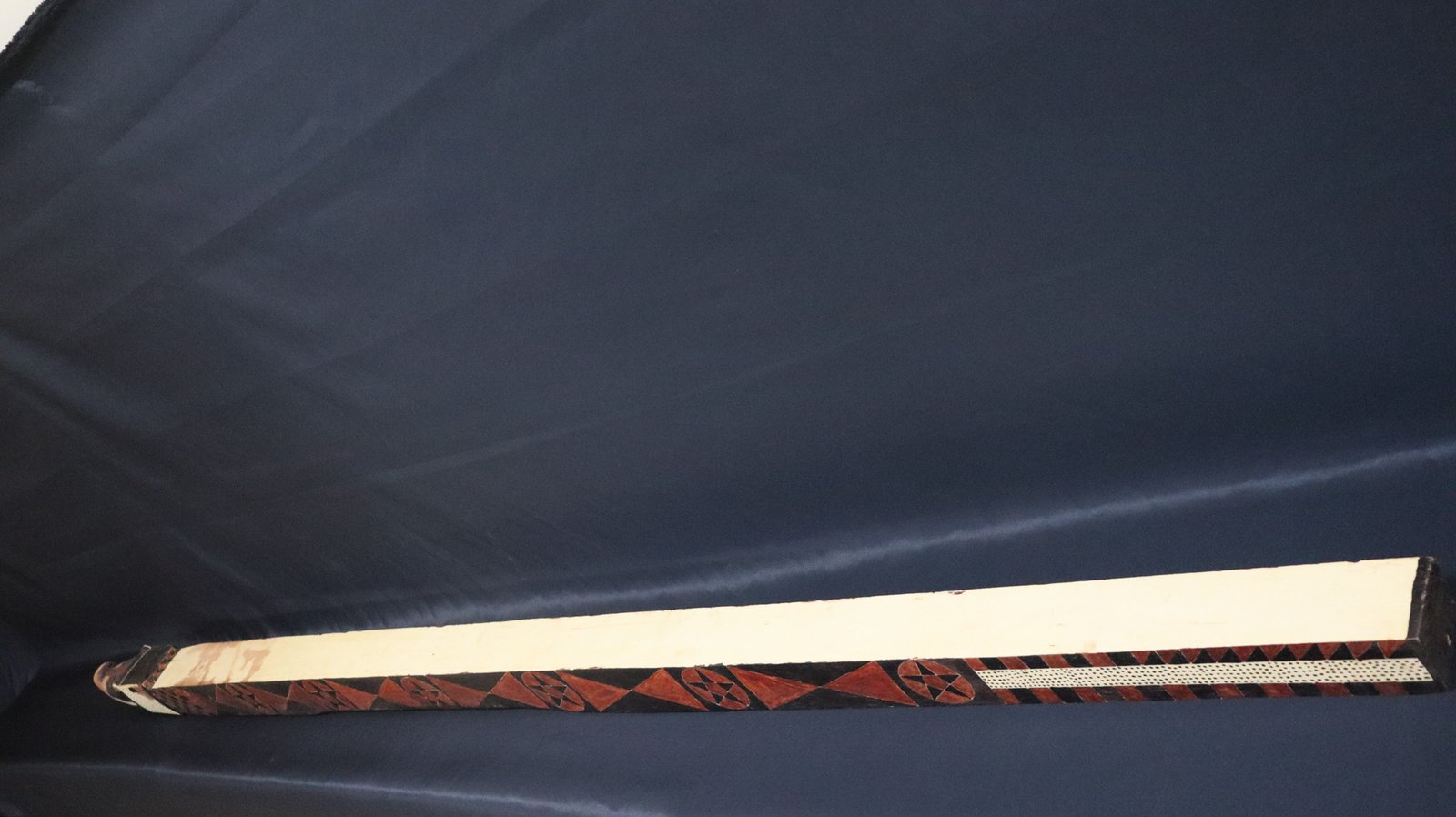 Banco de conformação retangular confeccionado com madeira de Marupá representando jacaré. Apresenta superfície superior lisa e laterais decorada com padrões geométricos e estrelas nas cores vermelho e preto. Exibe um uma das extremidades a cabeça do animal.