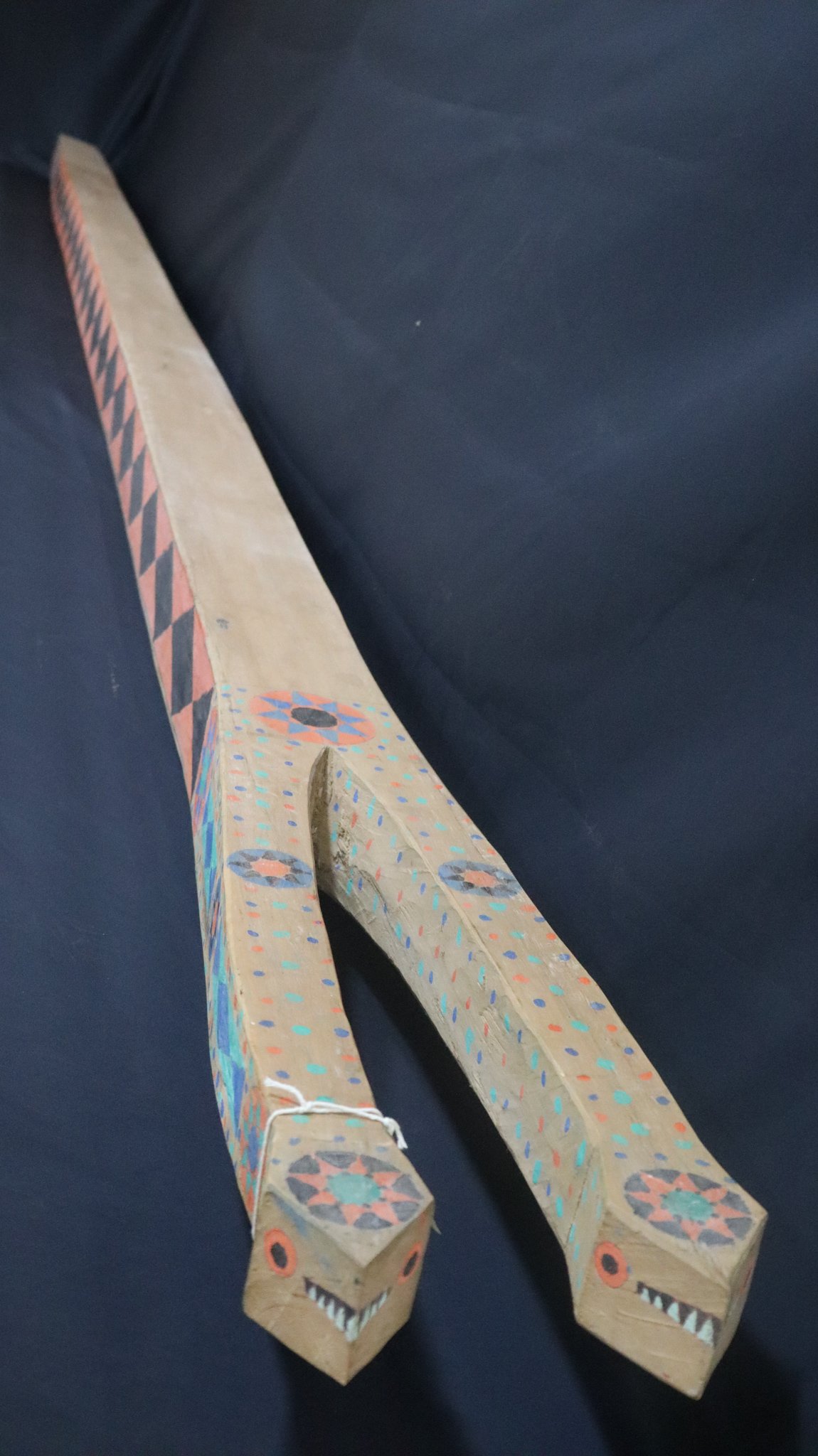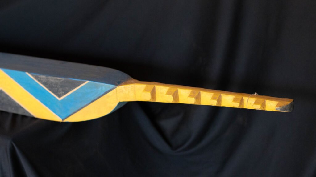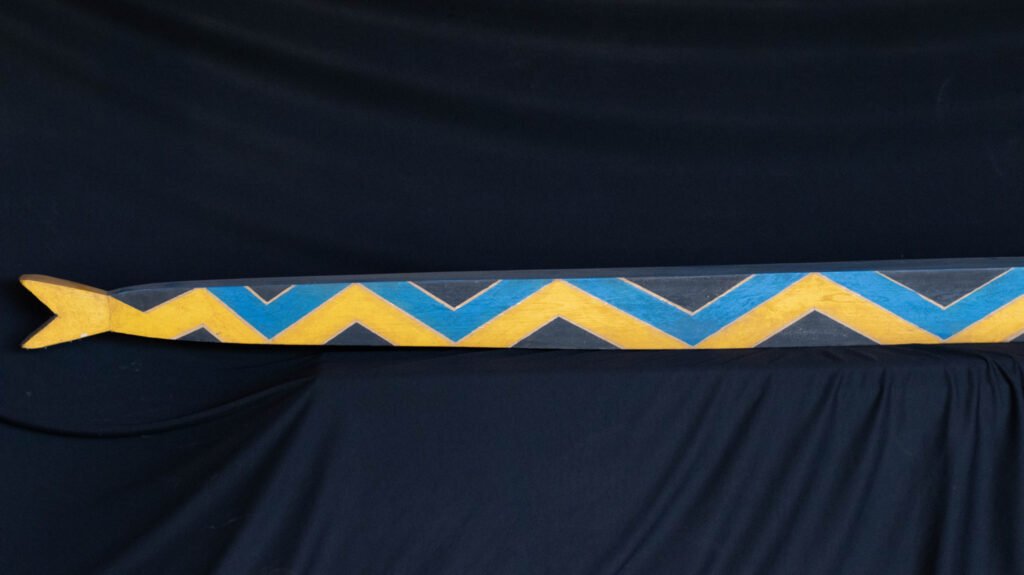 Banco de conformação retangular confeccionado com Marupá, representando espadarte. Apresenta superfície superior lisa e tingida de preto e laterais decorada com padrões dente d’água nas cores preto, azul e amarelo. Exibe nas extremidades cauda e cabeça do animal com o bico serrilhado.