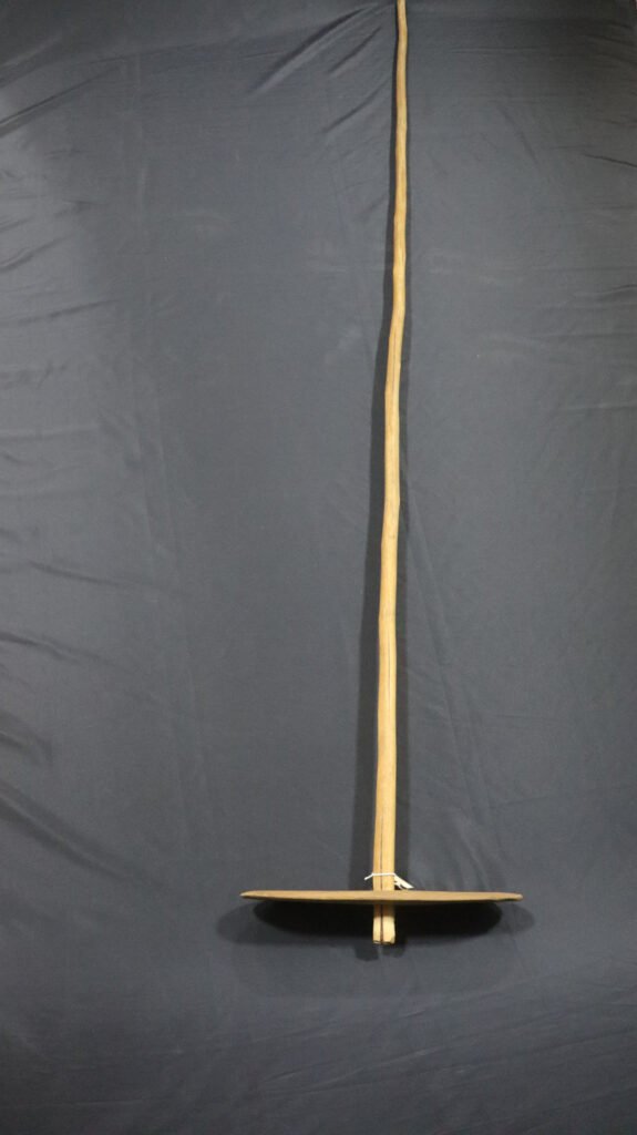 Rodo constituído de pá e cabo, pá de conformação oval, confeccionada em madeira caju e cabo de madeira caniço.
