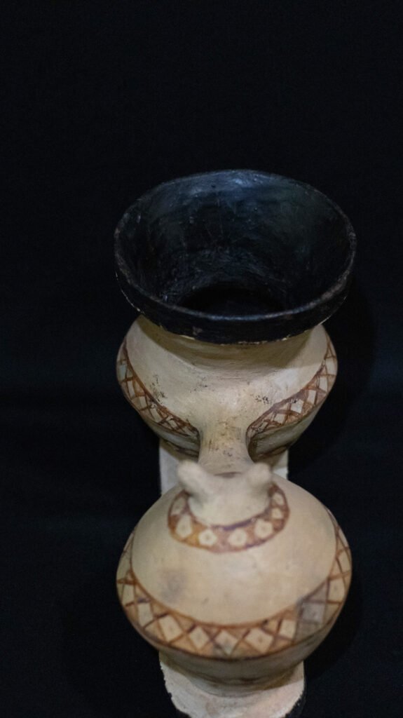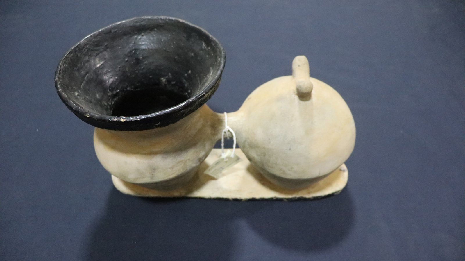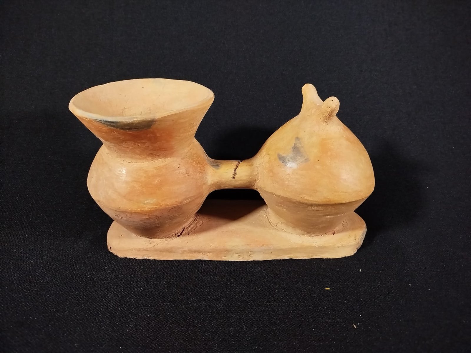 Bilhas comunicantes composta por dois recipientes unidos por meio de tubo cilíndrico. Um dos recipentes exibe boca circular, borda reta e bojo de contorno carenado com interior enegrecido. O segundo de conformação esférica exibindo, na parte superior, acabamento em forma de V. Ambos decorados com motivos geométricos e fixados sobre base oval.