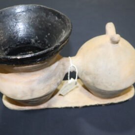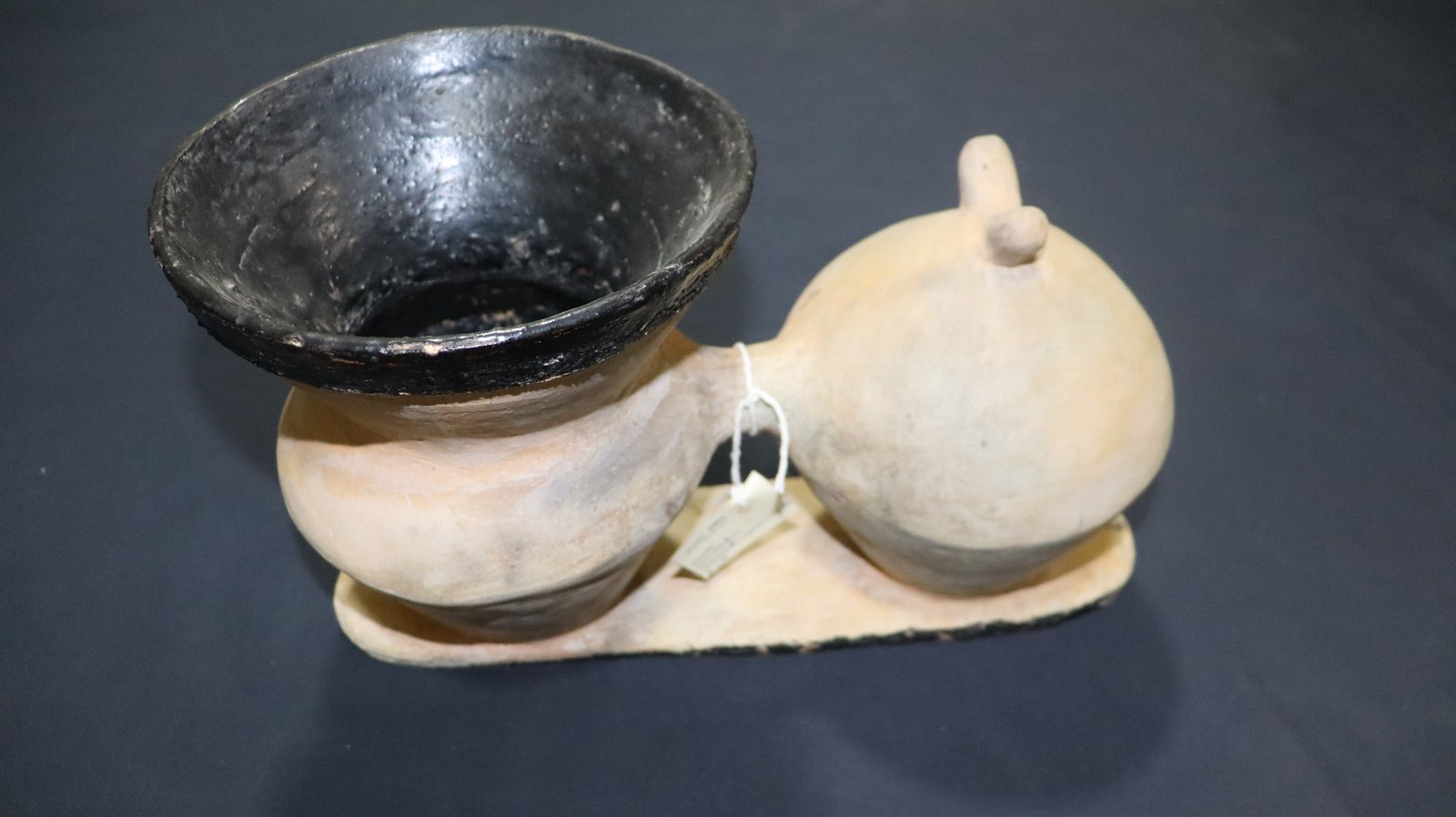 Bilhas comunicantes composta por dois recipientes unidos por meio de tubo cilíndrico. Um dos recipentes exibe boca circular, borda reta e bojo de contorno carenado enegrecido internamente. O segundo de conformação esférica exibindo, na parte superior, acabamento em forma de V. Ambos encontram-se fixados sobre base oval.