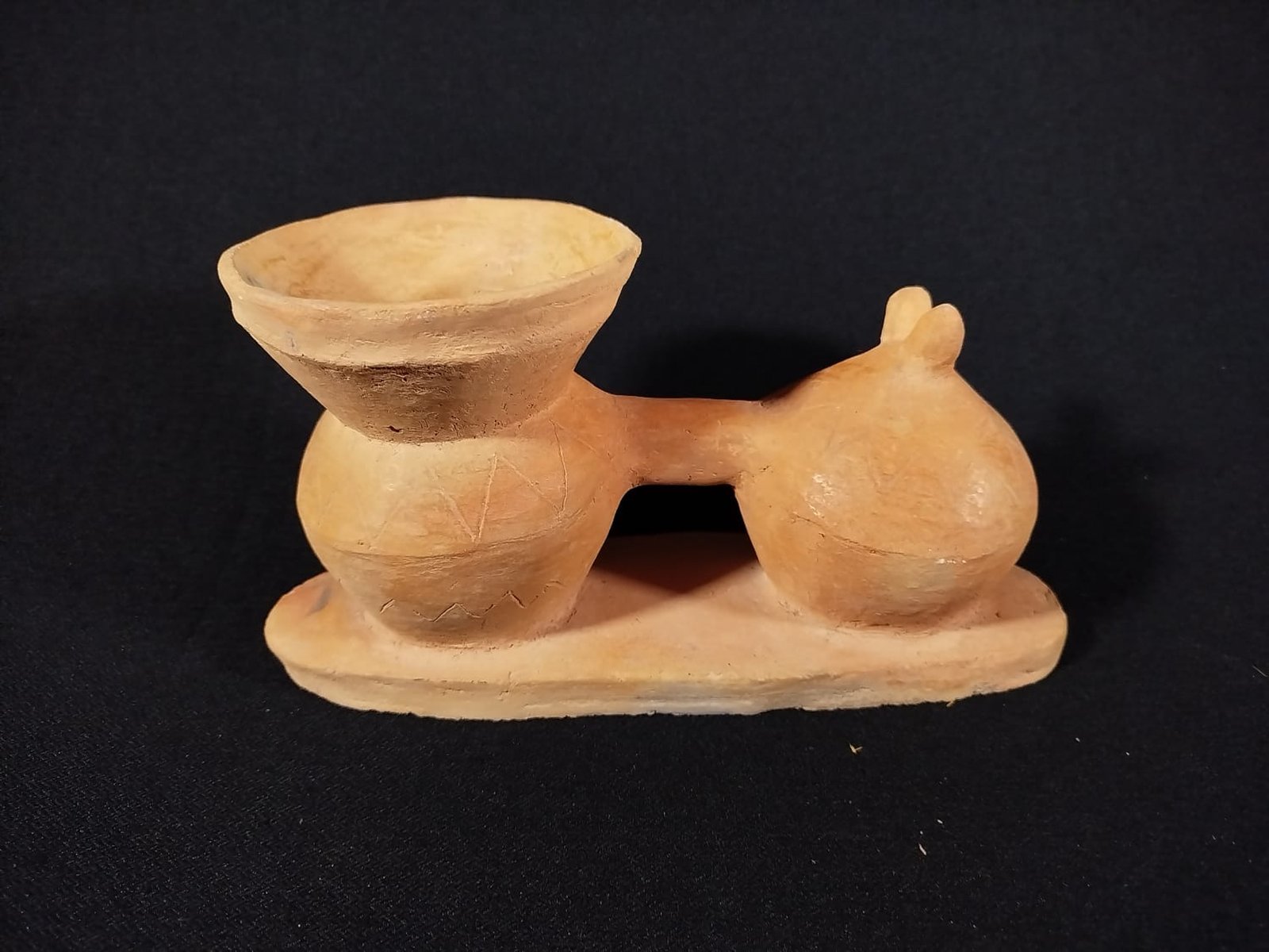 Bilhas comunicantes composta por dois recipientes unidos por meio de tubo cilíndrico. Um dos recipentes exibe boca circular, borda reta e bojo de contorno carenado, o segundo de conformação esférica exibindo, na parte superior, acabamento em forma de V. Ambos encontram-se fixados sobre base oval e possuem superfície e base decoradas com marcas kuahí, caminho de cobra e folha de açaí executadas com corante de urucum.