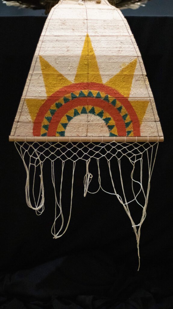 Amarração em nó rede de pesca | Fieira de penas sobre cordel base | Pintura | Trançado arqueado