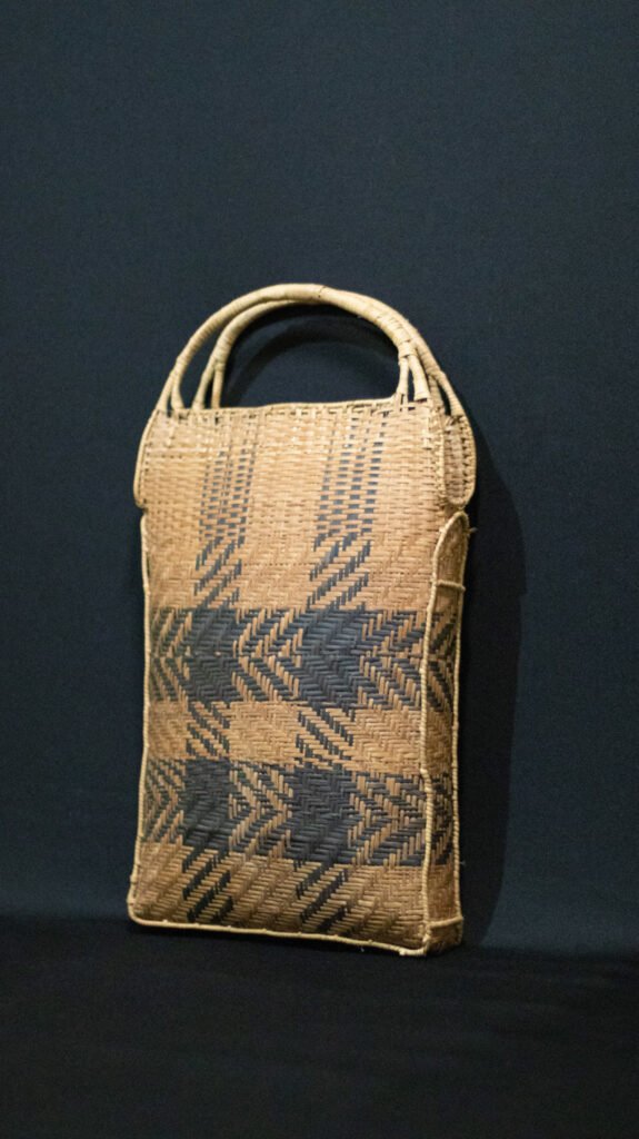 Cesto bolsiforme de conformação retantular provido de alça rígida, confeccionado com lasca de cipó de acitá nas cores natural e preto segundo a técnica do arqueado formando padrão decorativo kai atxipa (escama de tamatá).