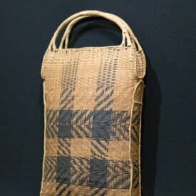 Cesto bolsiforme de conformação retantular provido de alça rígida, confeccionado com lasca de cipó de acitá nas cores natural e preto segundo a técnica do arqueado formando padrão decorativo kai atxipa (escama de tamatá).