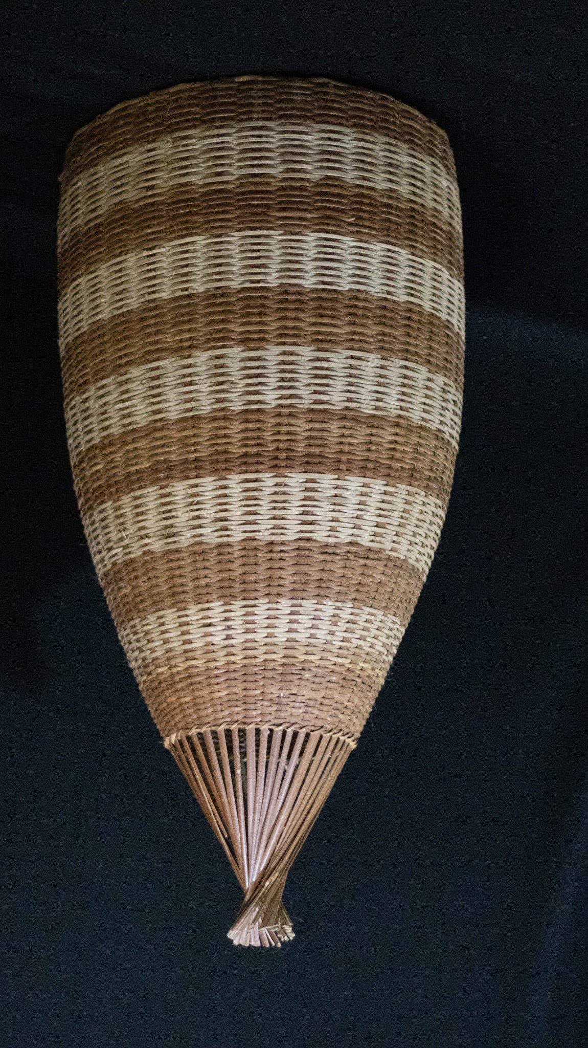 Cesto-cargueiro coniforme confeccinado com lasca de cipó titica segundo a técnico do arqueado. Apresenta superfície decorada com listas horizontais obtidas pelo tingimento da fibra com corante de cumatê.