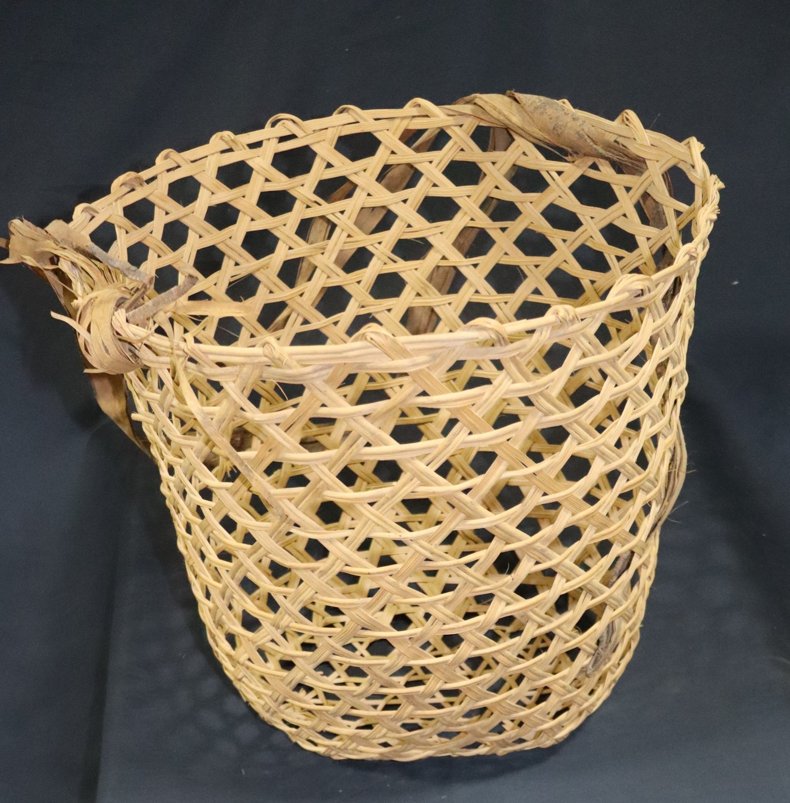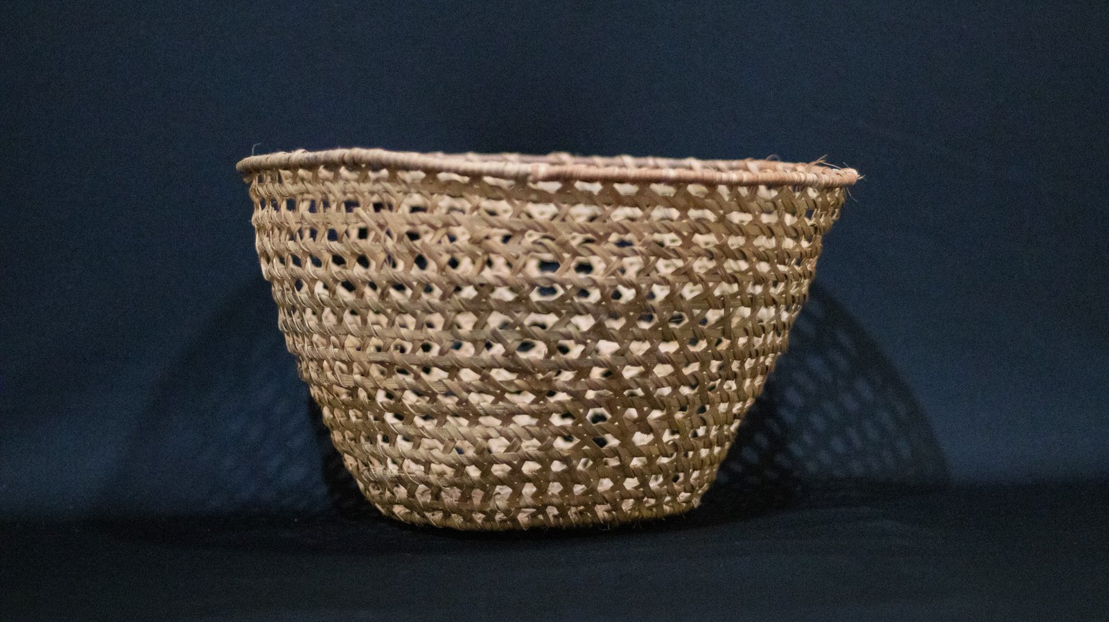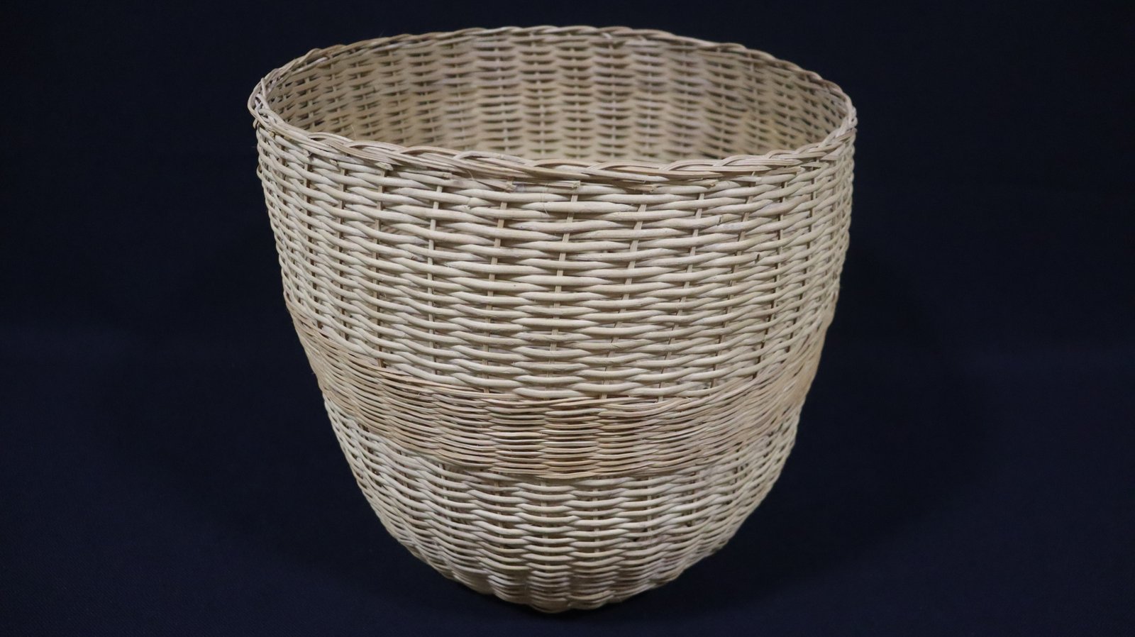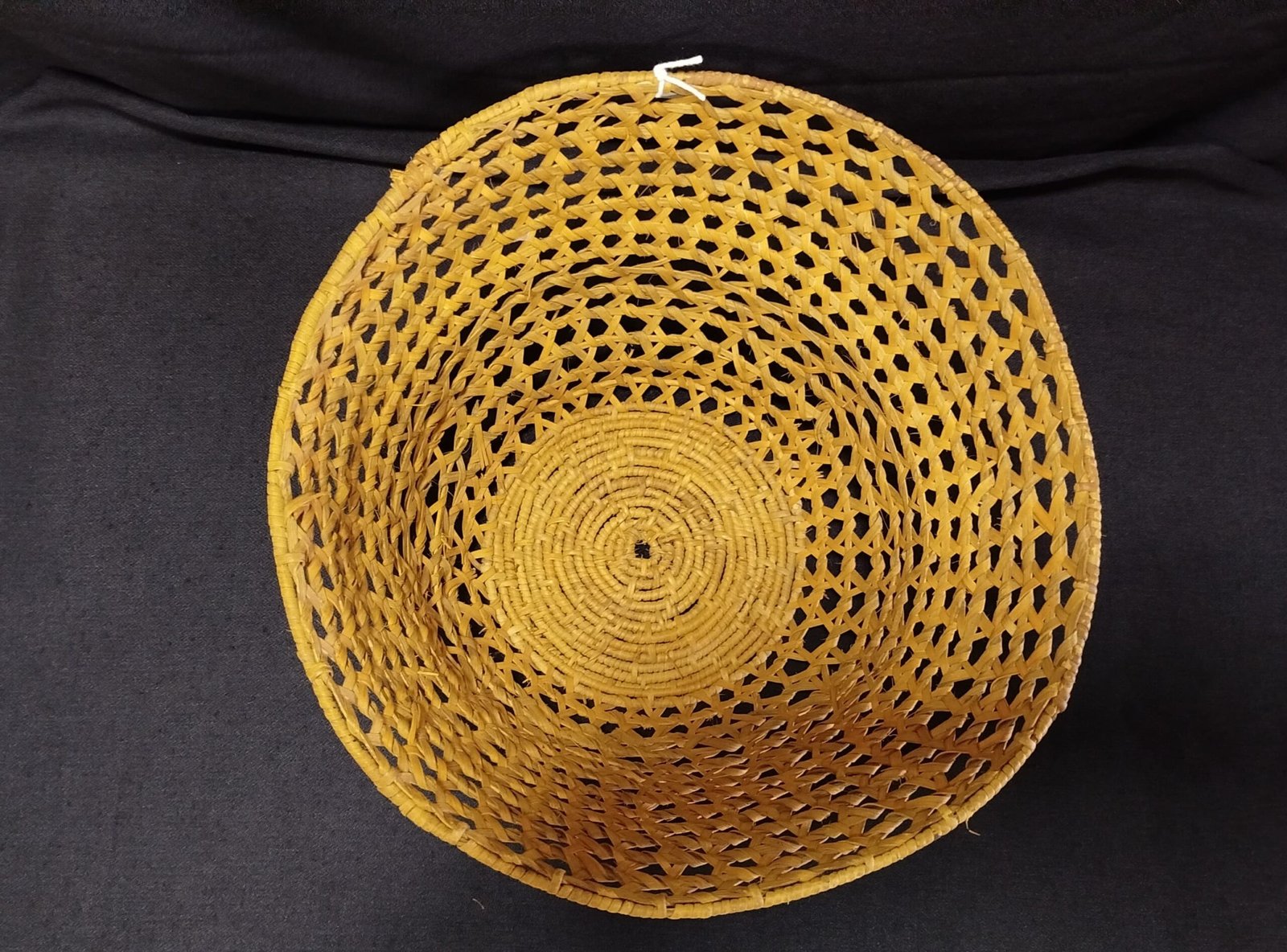 Cesto paneiriforme confeccionado com lasca de cipó titica segundo a técnica do hexagonal reticular com marca de kuahi.