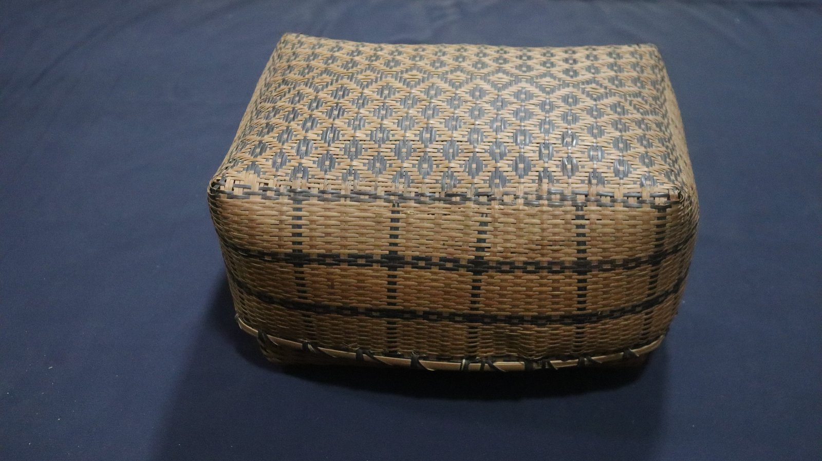 Cesto estojiforme de conformação retangular, confeccionados com tala de guarumã nas cores natural e tingida de preto com carvão e casca de xixi. Apresenta as laterais trançadas segundo a técnica do arqueado formando o padrão caminho da saúva e, superior segundo a técnica do sarjado, formando padrão kuahí grande.