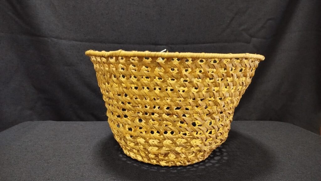 Cesto paneiriforme confeccionado com lasca de cipó titica segundo a técnica do hexagonal reticular com marca de kuahi.