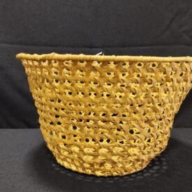 Paneiro de tamanho pequeno trançado hexagonal, usado para carregar mandioca, armazenar lixo recebe uma alça para suspender sendo seu uso pela cabeça a alça fica suspensa na testa.
