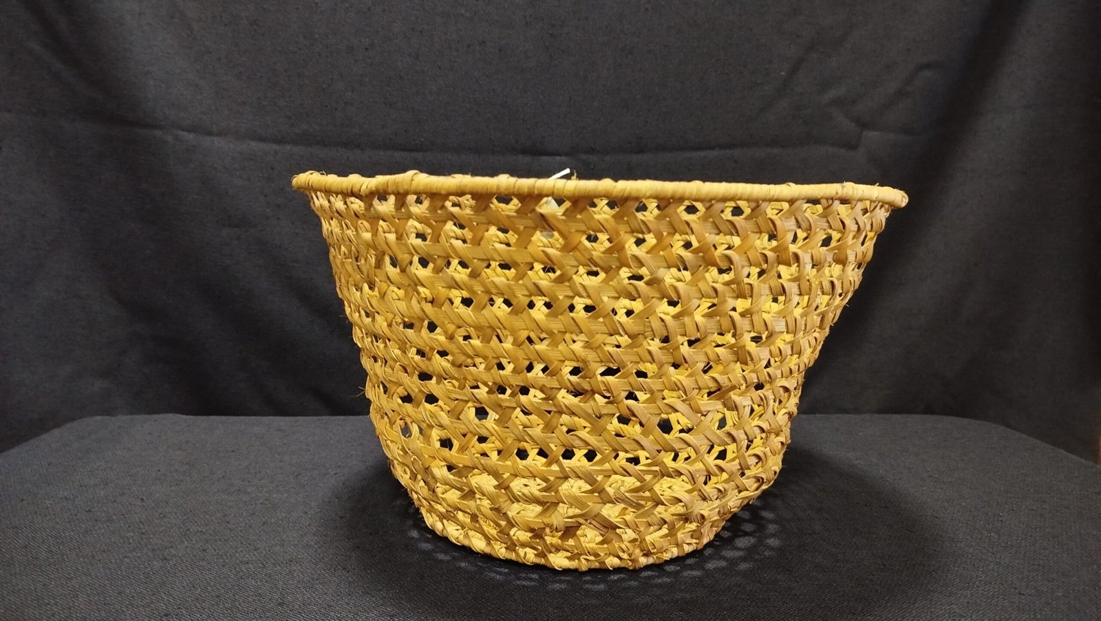 Cesto paneiriforme confeccionado com lasca de cipó titica segundo a técnica do hexagonal reticular com marca de kuahi.