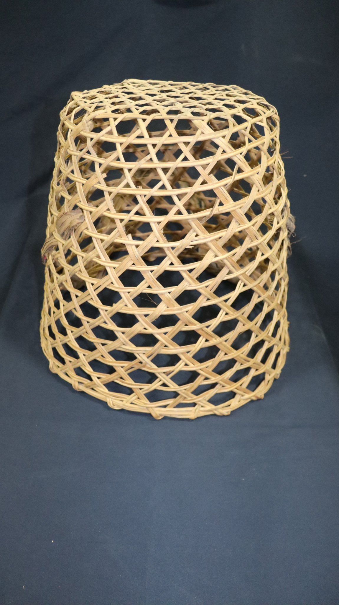 Cesto paneiriforme confeccionado com lasca de cipó titica segundo a técnica do hexagonal reticular com marca de kuahi.