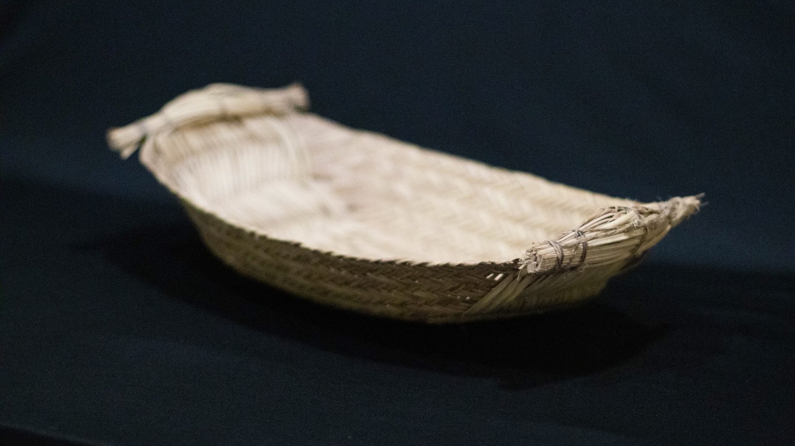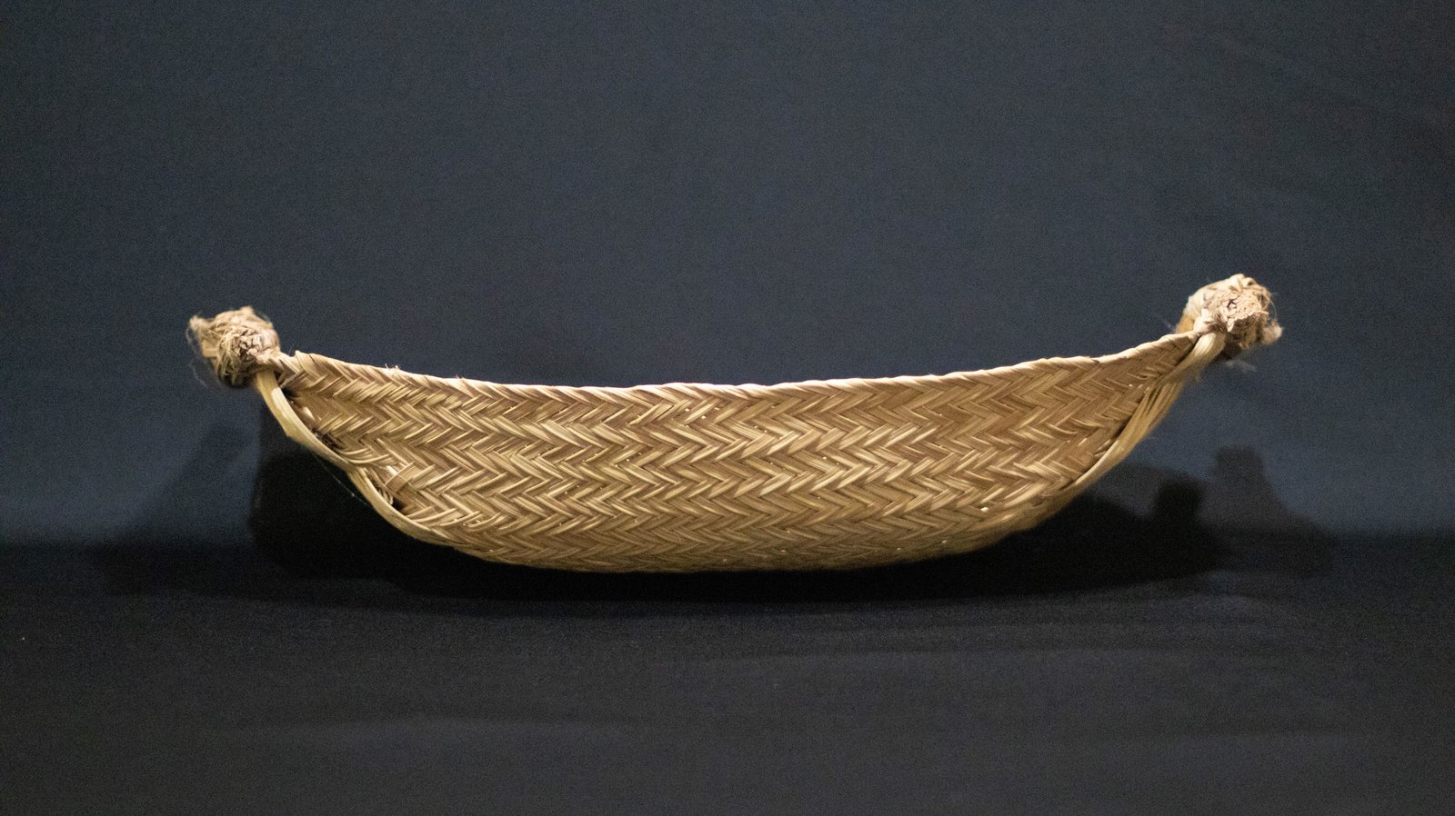 Cesto tigeliforme de conformação oval confeccionado folha de kunanã e grelo de buriti segundo a técnica do sarjado formando padrão kai atxipa (escama de tamuatá).