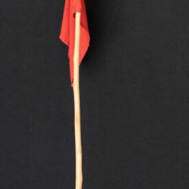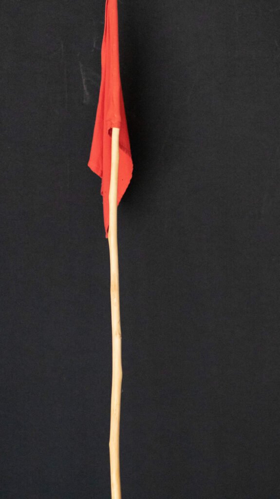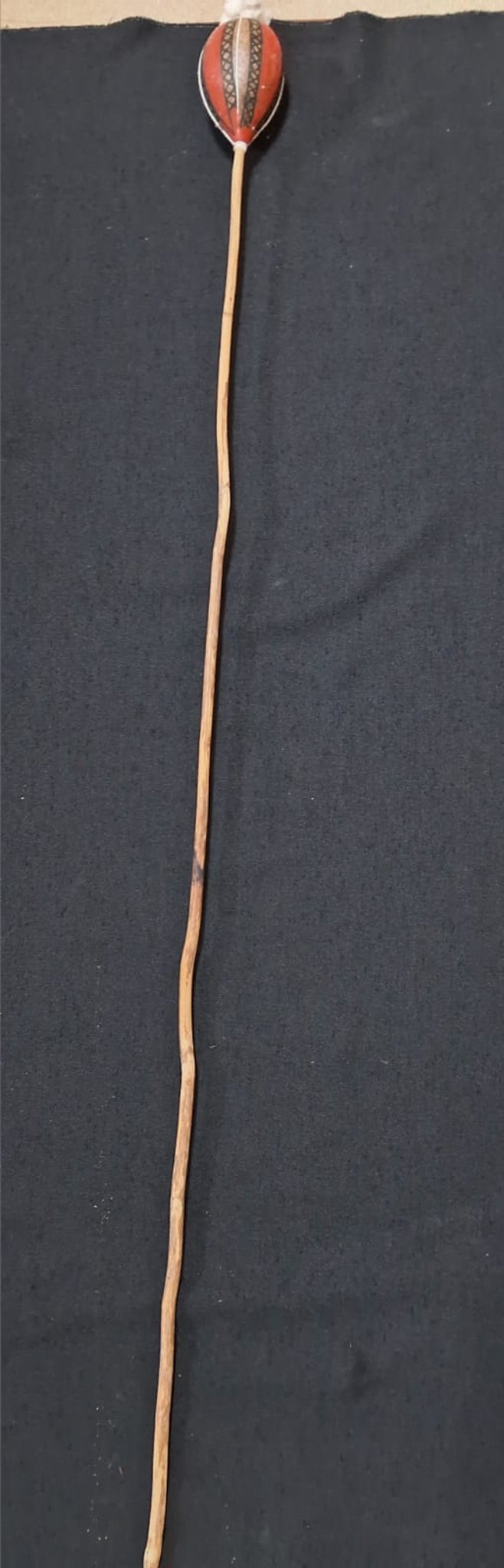Chocalho de vara confeccionado com recipiente de cuia presa a vara de madeira de miraúba que serve de cabo. Apresenta na base da cuia, ao seu redor, penas de arara e garça recortadas com marca dente d’água. Exibe sobre a cuia penas de garça e arara amarradas e coladas com cera de abelha. Possui na extensão da vara, próximo a cuia, tecido industrializado vermelho.