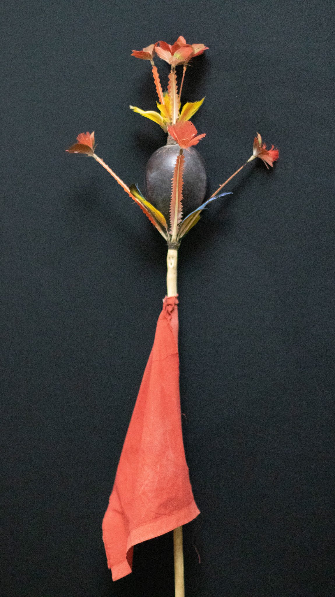 Chocalho de vara confeccionado com um recipiente de cuia fixado a uma haste de madeira de formato irregular. A cuia, localizada na extremidade superior, apresenta uma faixa branca com um padrão de pintura geométrica característico do povo indígena. Penas pretas, não identificadas, estão fixadas lateralmente na base da cuia, conferindo um elemento decorativo ao objeto. A fixação da cuia e dos elementos decorativos inclui fios de barbante e cera de abelha, garantindo a estabilidade da estrutura. O cabo da peça possui um aspecto levemente curvado e nodoso, sugerindo o uso de um galho ou haste natural sem grandes modificações.
