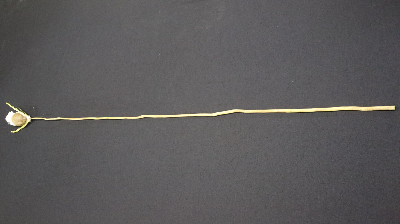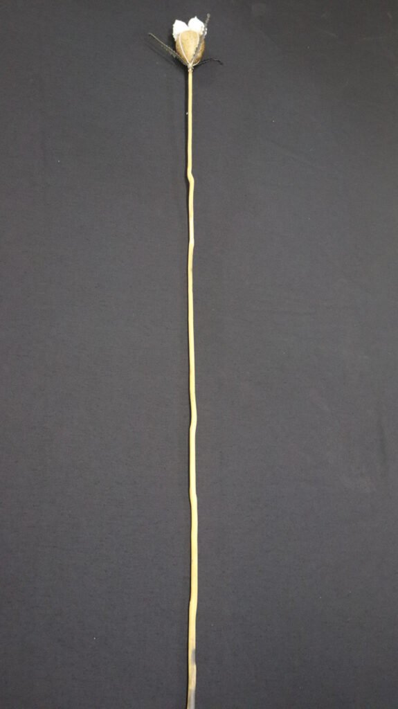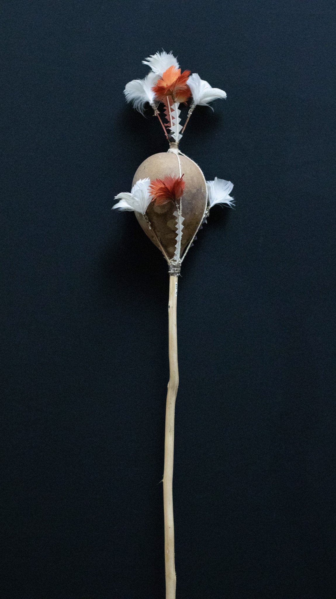 Objeto de cabo fino e longo, com uma cuia pequena colocada na ponta da vareta, colada com cera de abelha, algodão junto a cuia e penas.