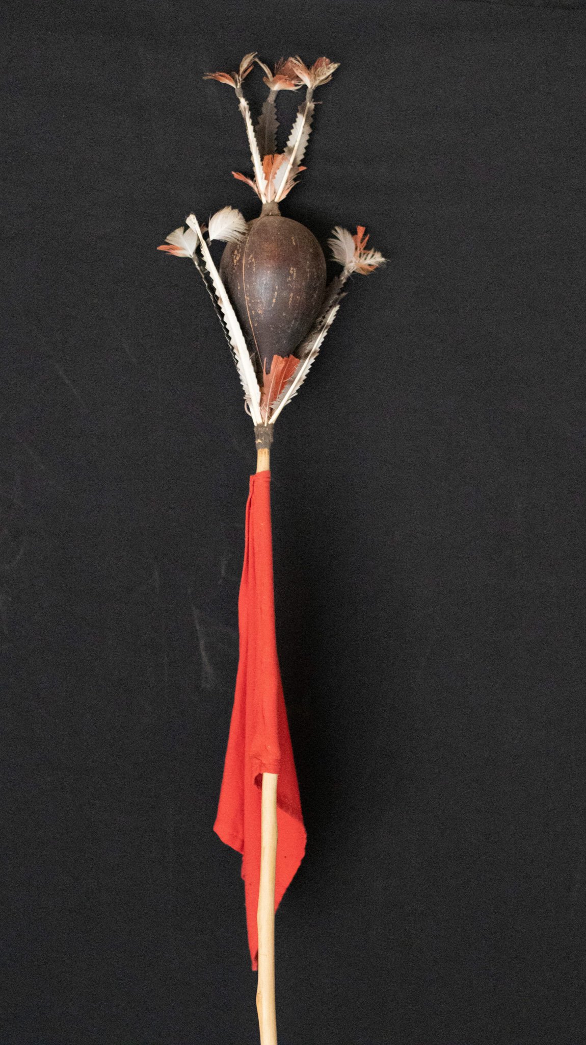 Chocalho de vara confeccionado com recipiente de cuia presa a vara de madeira marupá que serve de cabo. Apresenta na extremidade cuia fixada com cera de abelha tendo, na base e sobre ela, tufos de algodão.