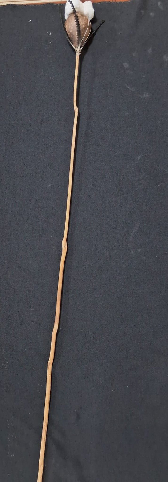 Objeto de cabo fino e longo, com uma cuia pequena colocada na ponta da vareta, colada com cera de abelha, algodão junto a cuia.