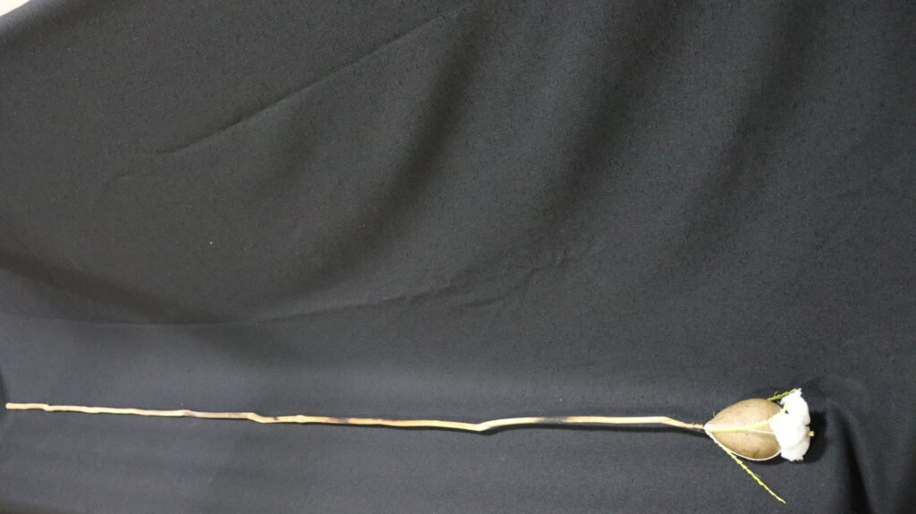 Objeto de cabo fino e longo, com uma cuia pequena colocada na ponta da vareta, colada com cera de abelha, algodão junto a cuia e penas.