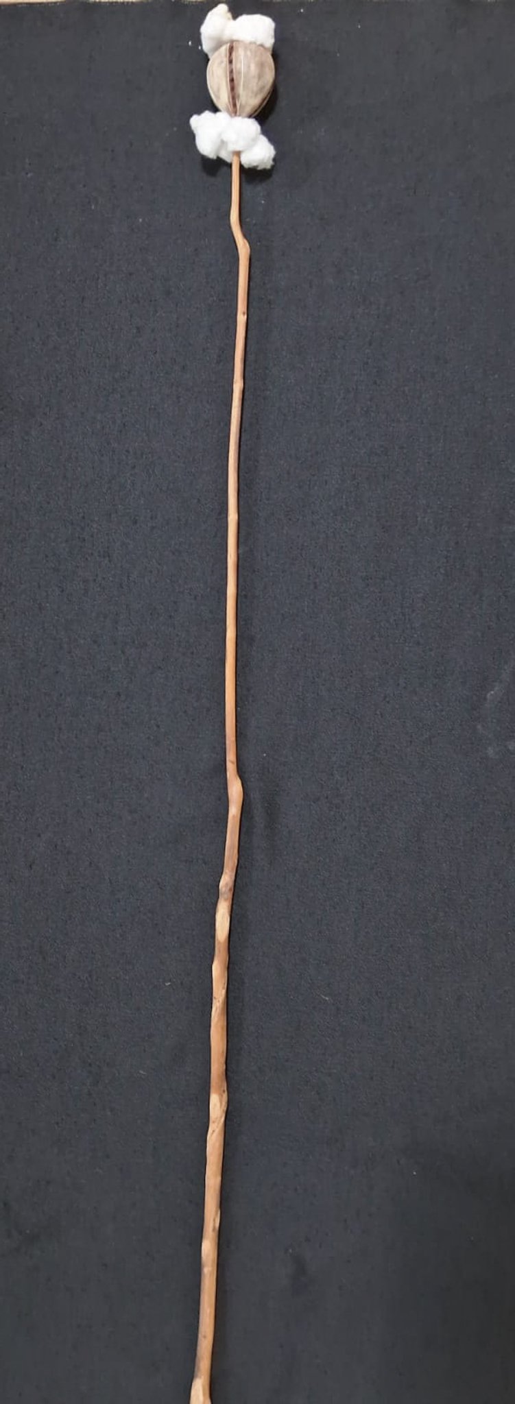 Chocalho de vara confeccionado com recipiente de cuia presa a vara de madeira de miraúba que serve de cabo. Apresenta na base da cuia, ao seu redor, penas de arara e de garça recortadas com marca dente d’água. Exibe sobre a cuia penas de garça e arara amarradas e coladas com cera de abelha. Possui na extensão da vara, próximo a cuia, tecido industrializado vermelho.