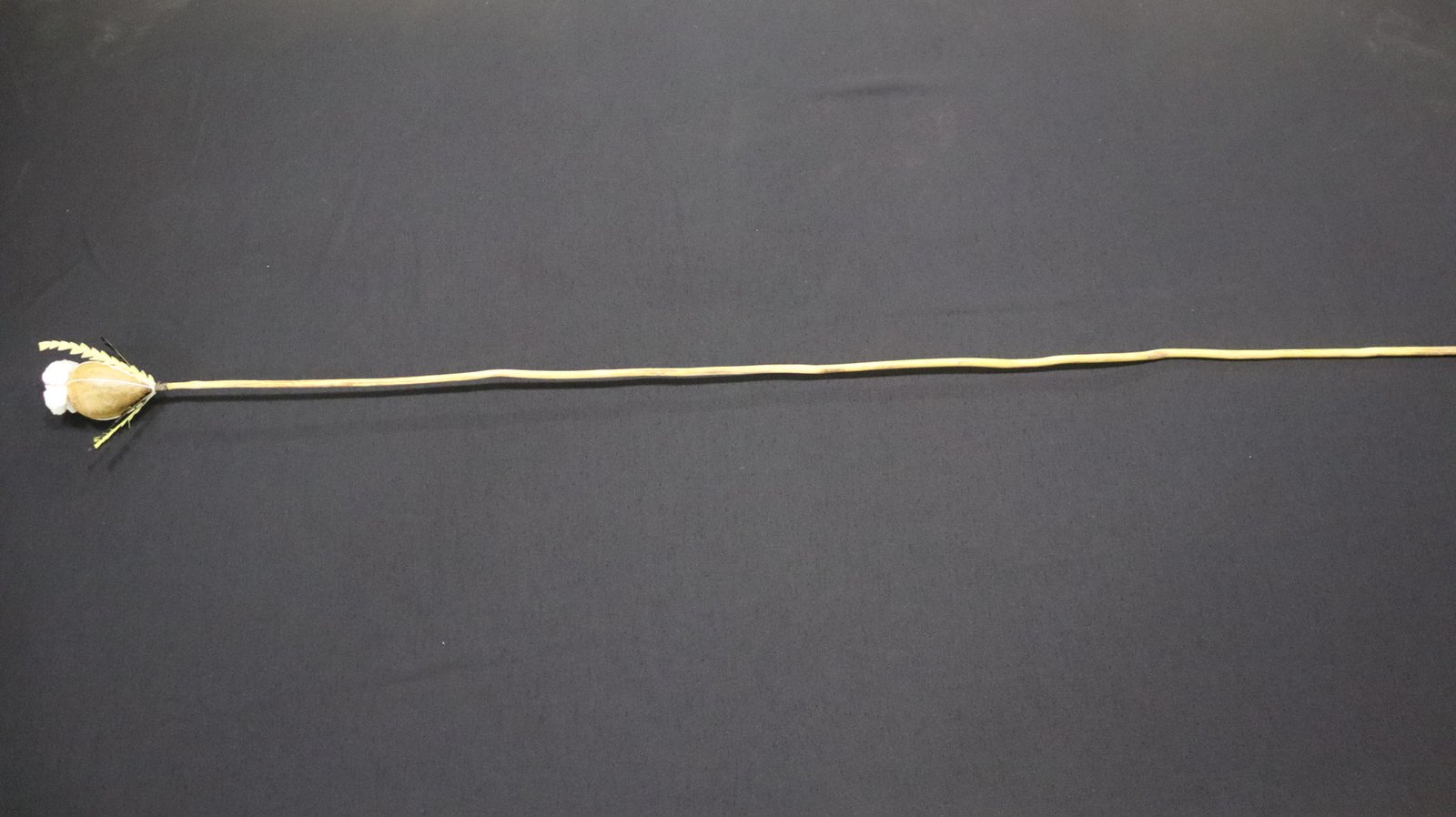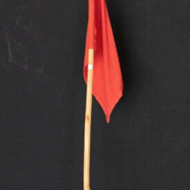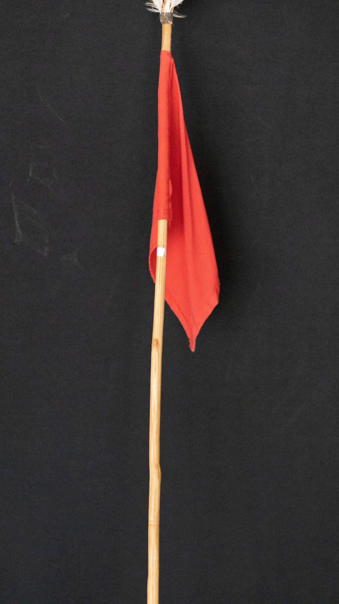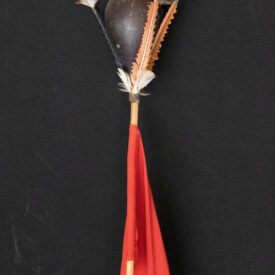 Chocalho de vara confeccionado com recipiente de cuia presa a vara de madeira de miraúba que serve de cabo. Apresenta na base da cuia, ao seu redor, penas de arara e garça recortadas com marca dente d’água. Exibe sobre a cuia penas de garça e arara amarradas e coladas com cera de abelha. Possui na extensão da vara, próximo a cuia, tecido industrializado vermelho.