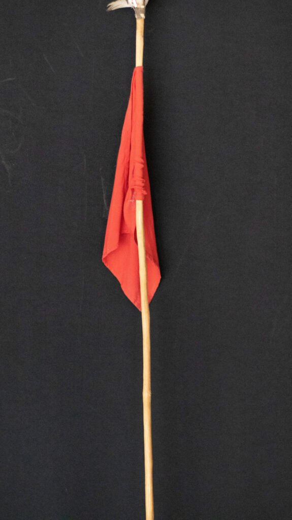 Chocalho de vara confeccionado com recipiente de cuia presa a vara de madeira de miraúba que serve de cabo. Apresenta na base da cuia, ao seu redor, penas de arara e garça recortadas com marca dente d’água. Exibe sobre a cuia penas de garça e arara amarradas e coladas com cera de abelha. Possui na extensão da vara, próximo a cuia, tecido industrializado vermelho.