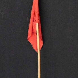 Chocalho de vara confeccionado com recipiente de cuia presa a vara de madeira de miraúba que serve de cabo. Apresenta na base da cuia, ao seu redor, penas de arara e garça recortadas com marca dente d’água. Exibe sobre a cuia penas de garça e arara amarradas e coladas com cera de abelha. Possui na extensão da vara, próximo a cuia, tecido industrializado vermelho.