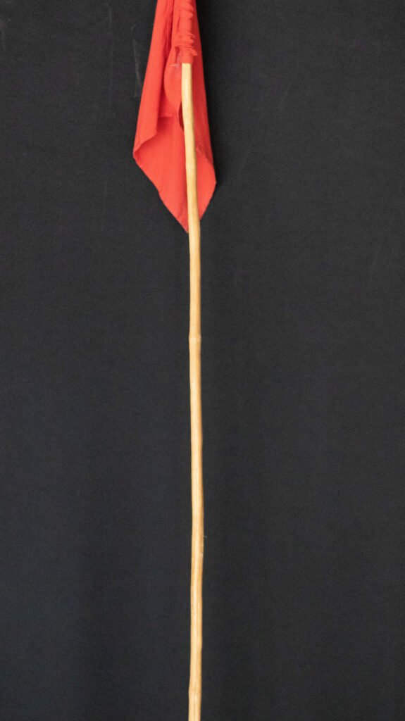 Chocalho de vara confeccionado com recipiente de cuia presa a vara de madeira de miraúba que serve de cabo. Apresenta na base da cuia, ao seu redor, penas de arara e garça recortadas com marca dente d’água. Exibe sobre a cuia penas de garça e arara amarradas e coladas com cera de abelha. Possui na extensão da vara, próximo a cuia, tecido industrializado vermelho.