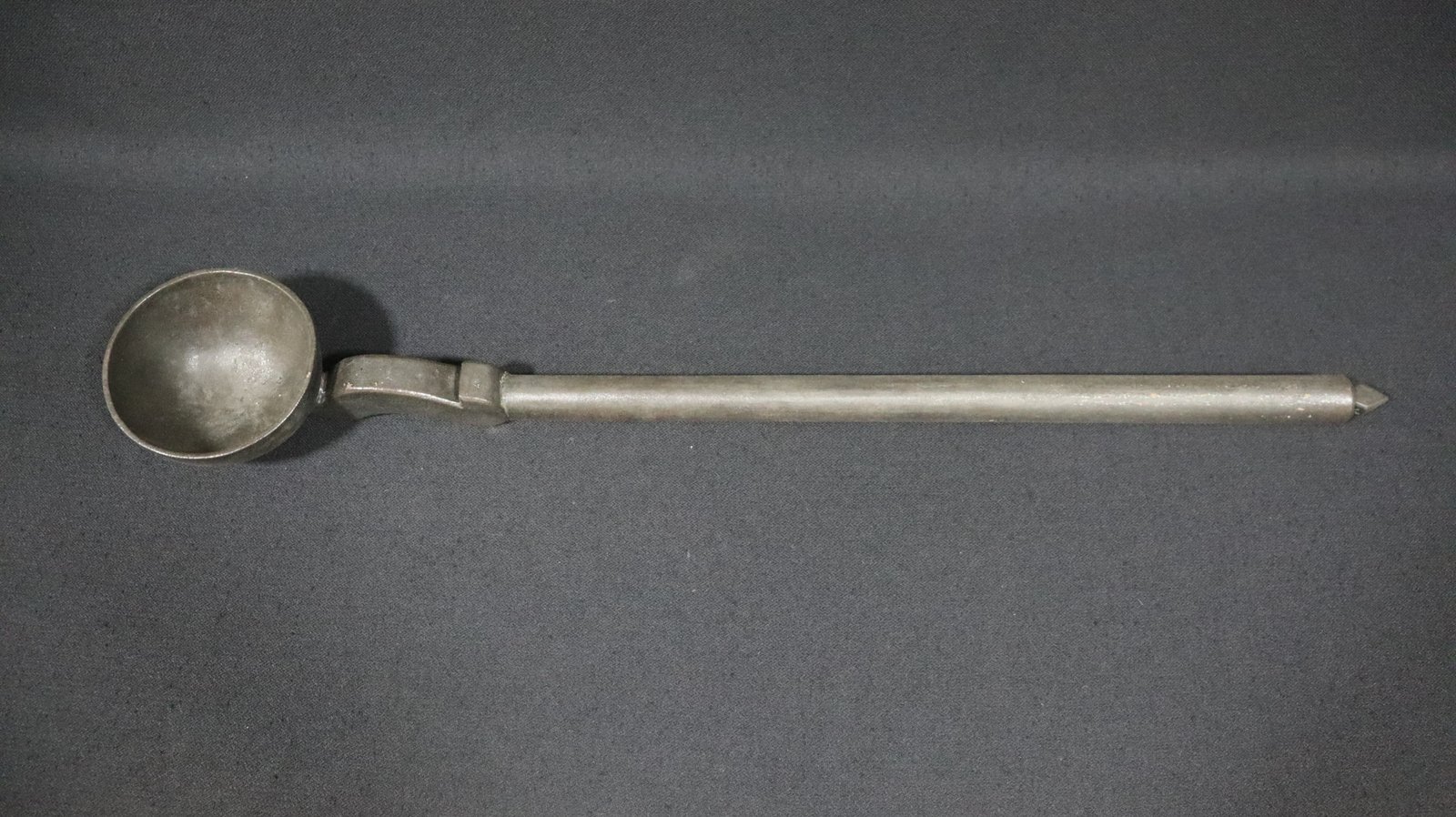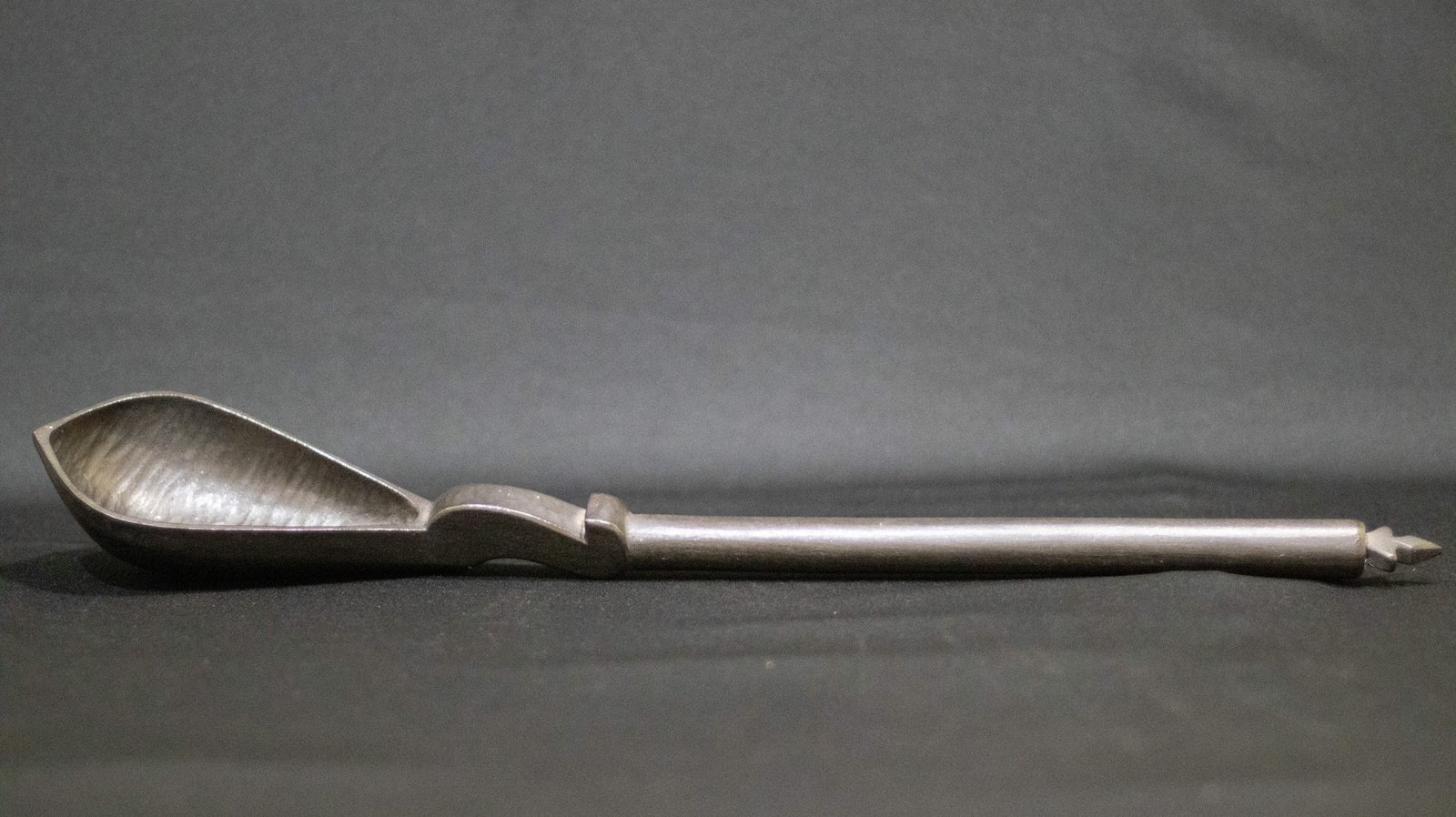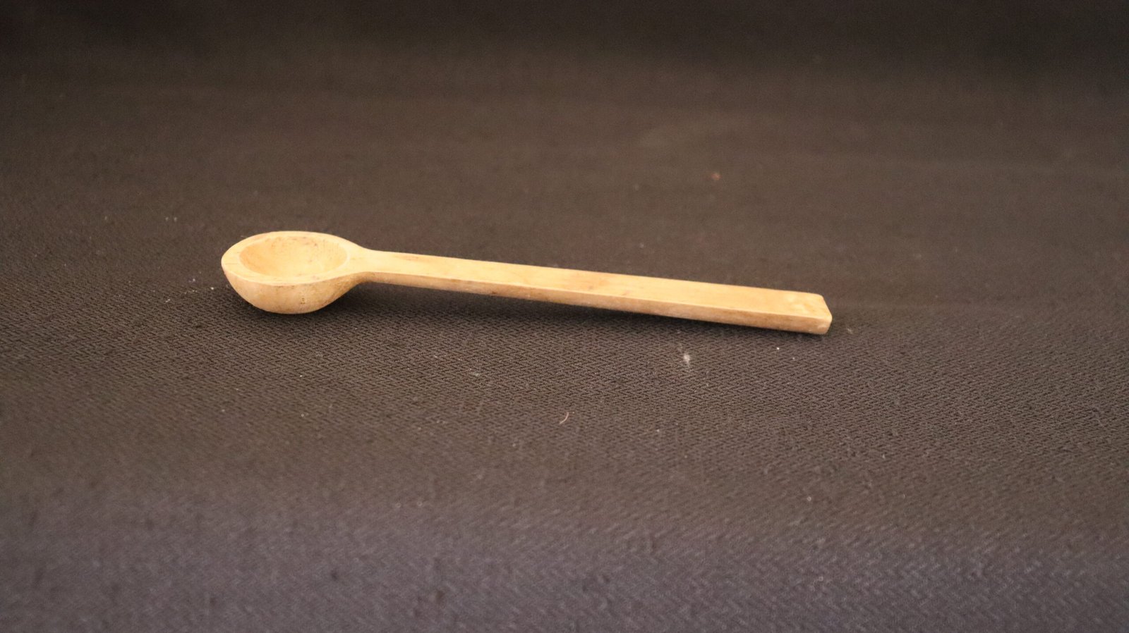 Colher de pau côncava confeccionada com madeira não identificada apresentando concha oval e cabo reto.