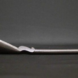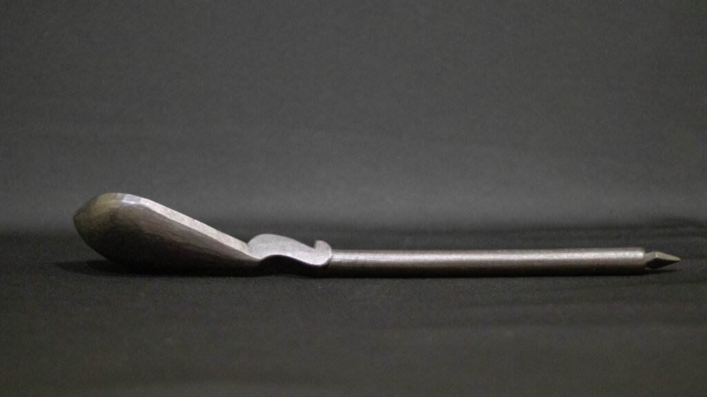 Colher de pau côncava, confeccionado com madeira de jenipapo . Apresenta superfície enegrecida com corante de jenipapo.