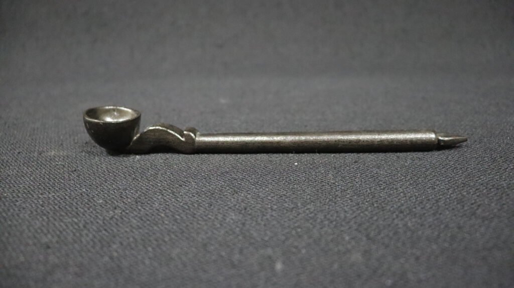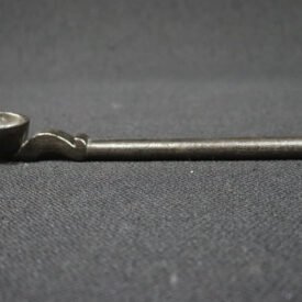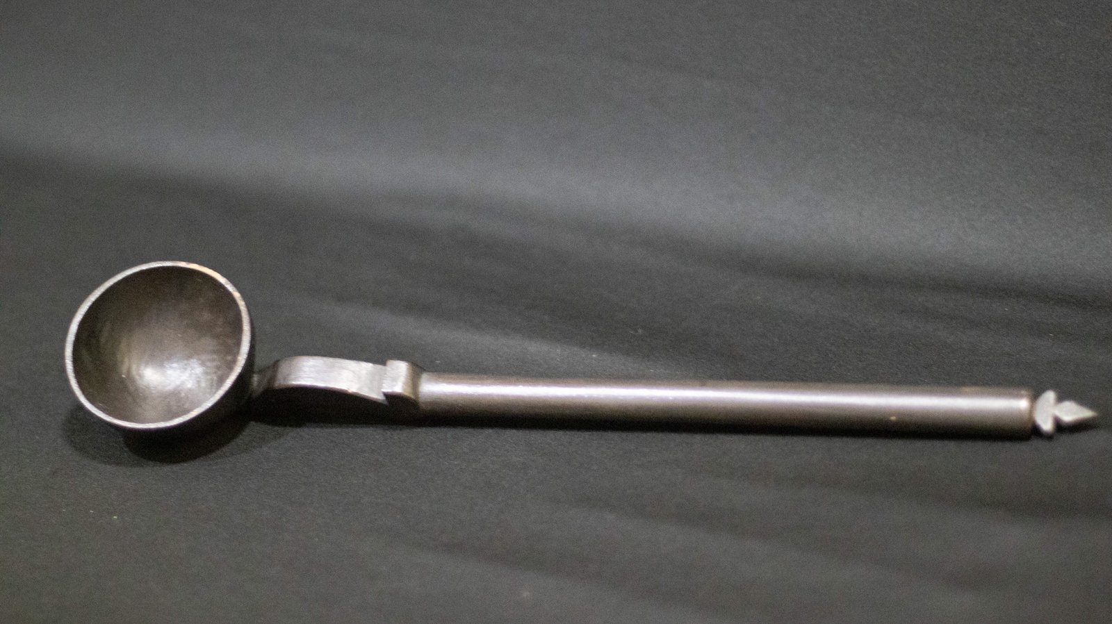 Colher de pau côncava, confeccionado com madeira de jenipapo . Apresenta superfície enegrecida com corante de jenipapo.