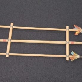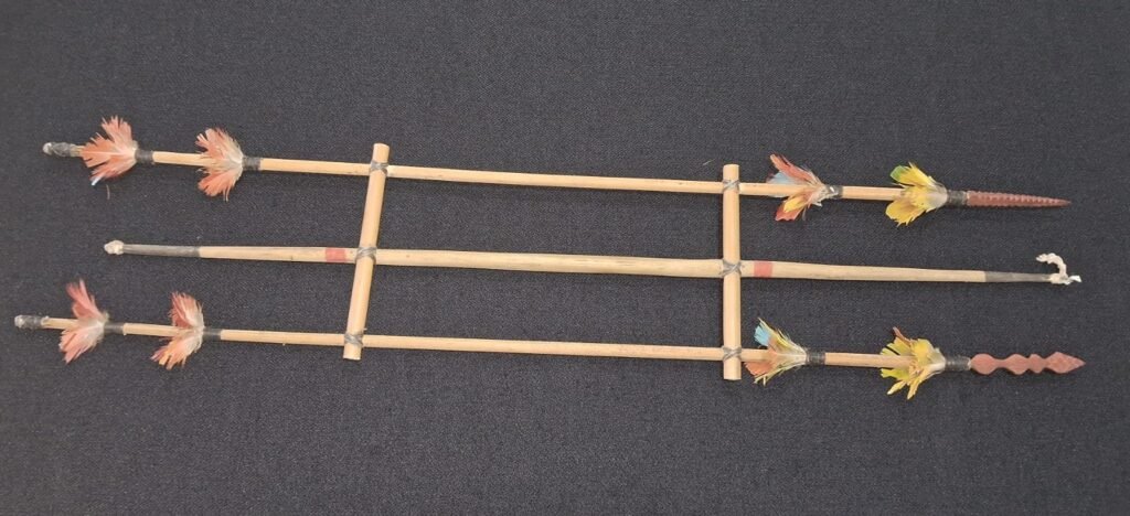Conjunto de flechas formado por três flechas. As flechas apresentam haste e pontas de madeira não identificas e pontas diferenciadas, a primeira possui ponta serrilhada, a central, ponta espeque e a terceira com ponta não identificada. As flechas de pontas serrilhada e não identificadas apresentam abaixo das pontas e na extremidade distal decoração com penas de arara disponstas em roseta.