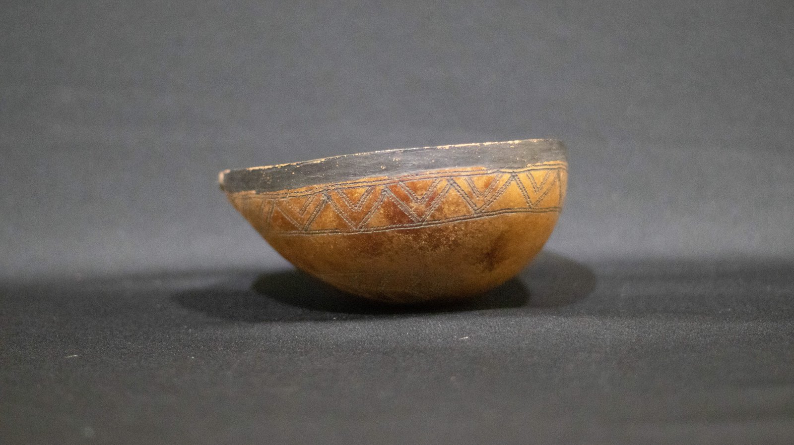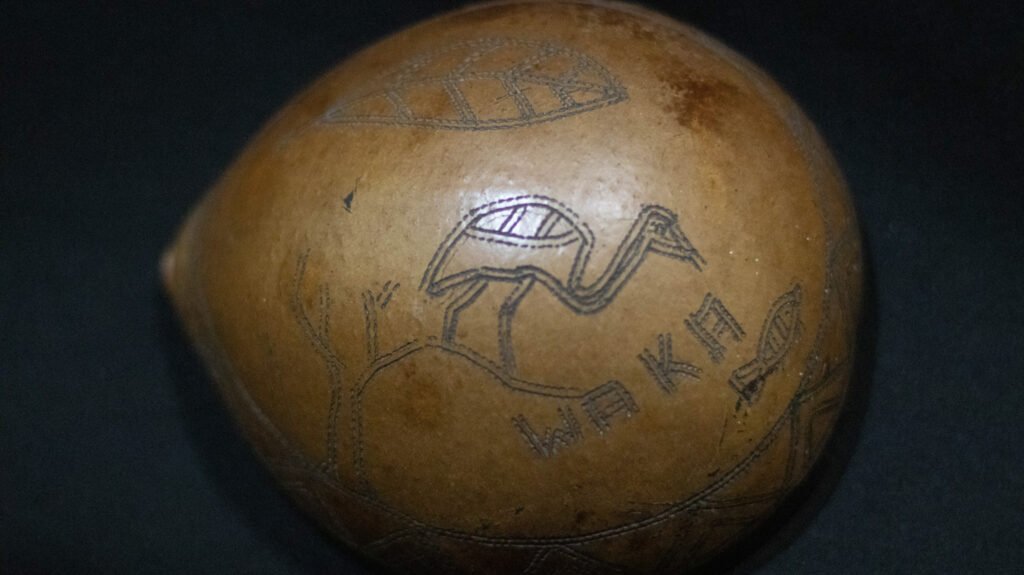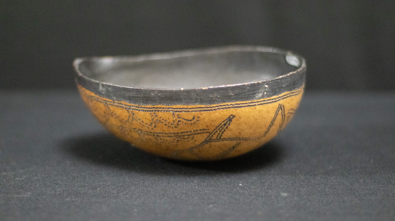 Cuia confeccionada com o fruto maduro da cuieira cortado ao meio. Apresenta parte interna tingida de preto e externa com listra preta, listra dãdelo, garça, peixe, folha, árvore e o nome waka.