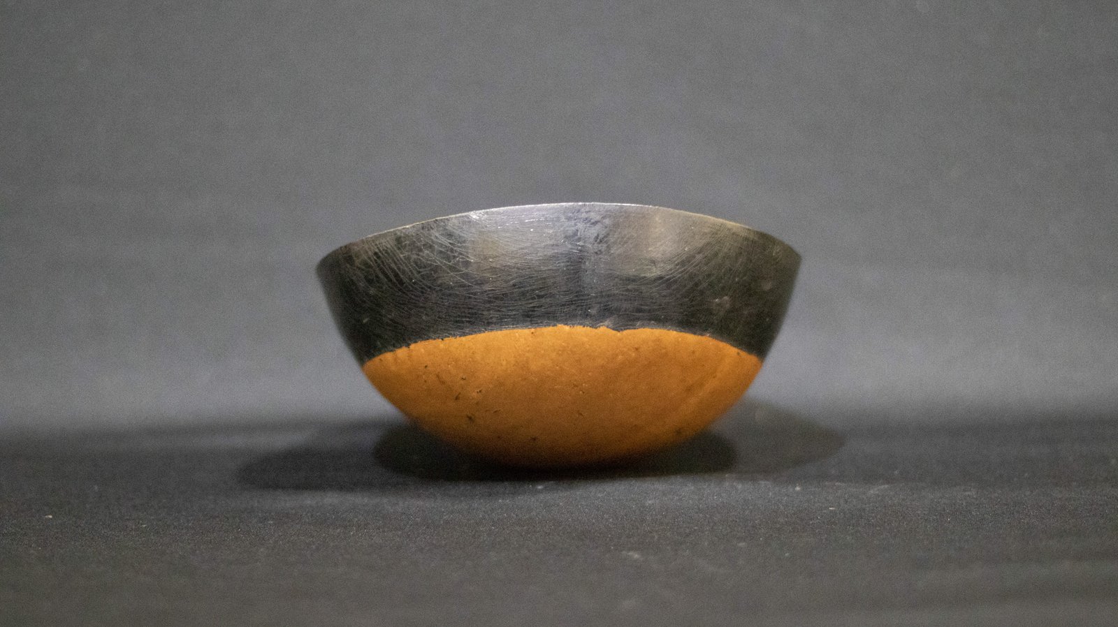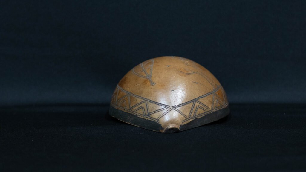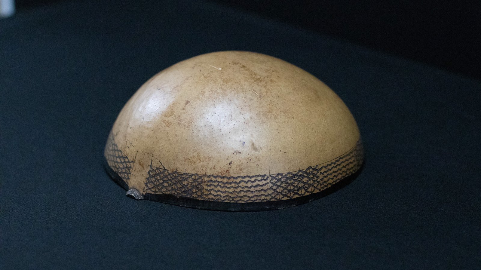 Cuia cortada no meio, raspada por dentro, pintada com tinta de kumatê (tira-se a casca de pau bate bem e põe para ferver até ficar preto e grosso, deixa esfriar e pinta a cuia) depois de pintada é colocada em cima da cinza com xixi para que ela fique bem preta e brilhosa.