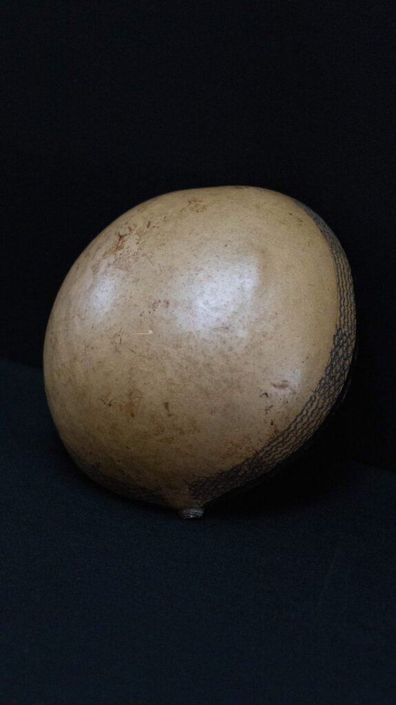 Cuia cortada no meio, raspada por dentro, pintada com tinta de kumatê (tira-se a casca de pau bate bem e põe para ferver até ficar preto e grosso, deixa esfriar e pinta a cuia) depois de pintada é colocada em cima da cinza com xixi para que ela fique bem preta e brilhosa.