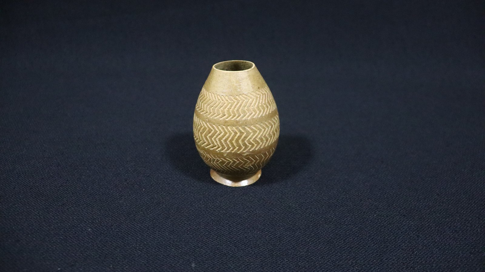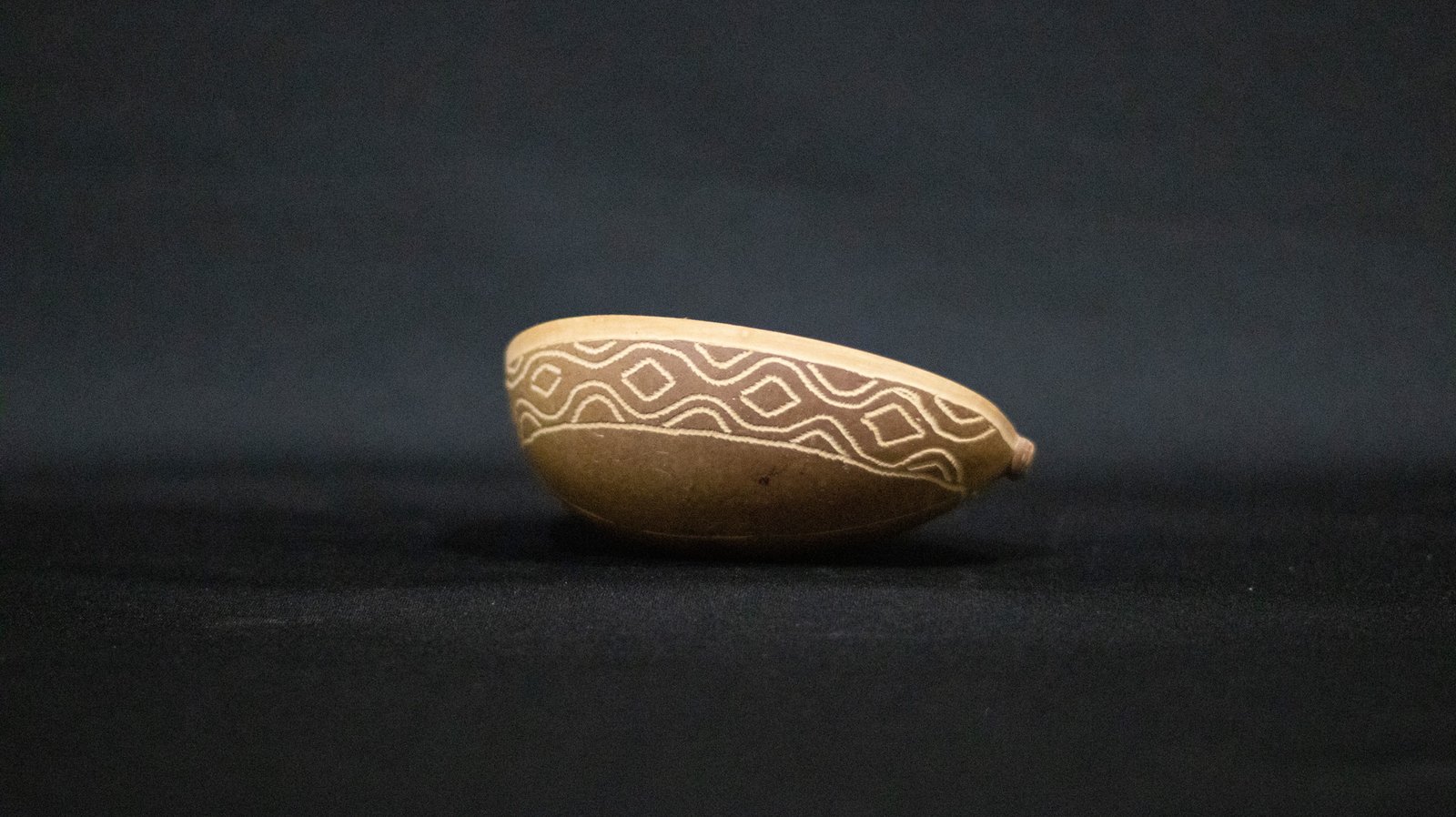 Cuia confeccionada com o fruto maduro da cuieira cortado ao meio. Apresenta parte interna tingida de preto e externa com listra preta, kuahí pequeno e dãdelo pequeno.