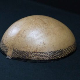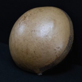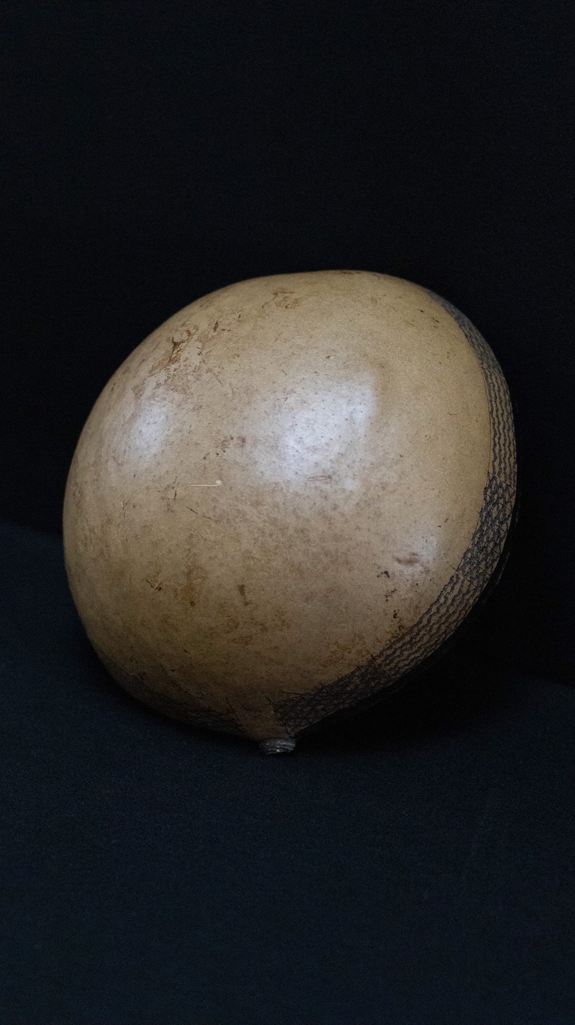 Cuia confeccionada com o fruto maduro da cuieira cortado ao meio. Apresenta parte interna tingida de preto e externa com listra preta, kuahí pequeno e dãdelo pequeno.