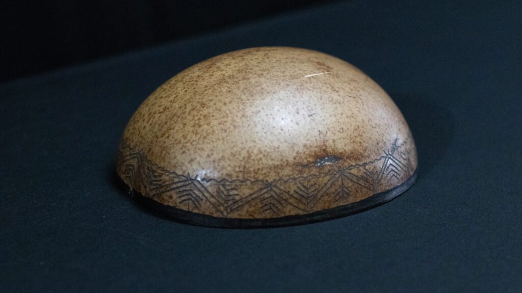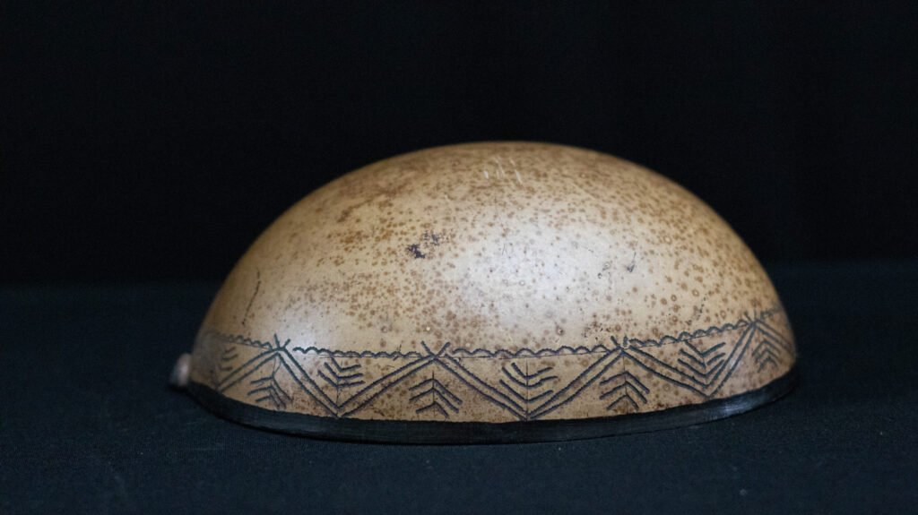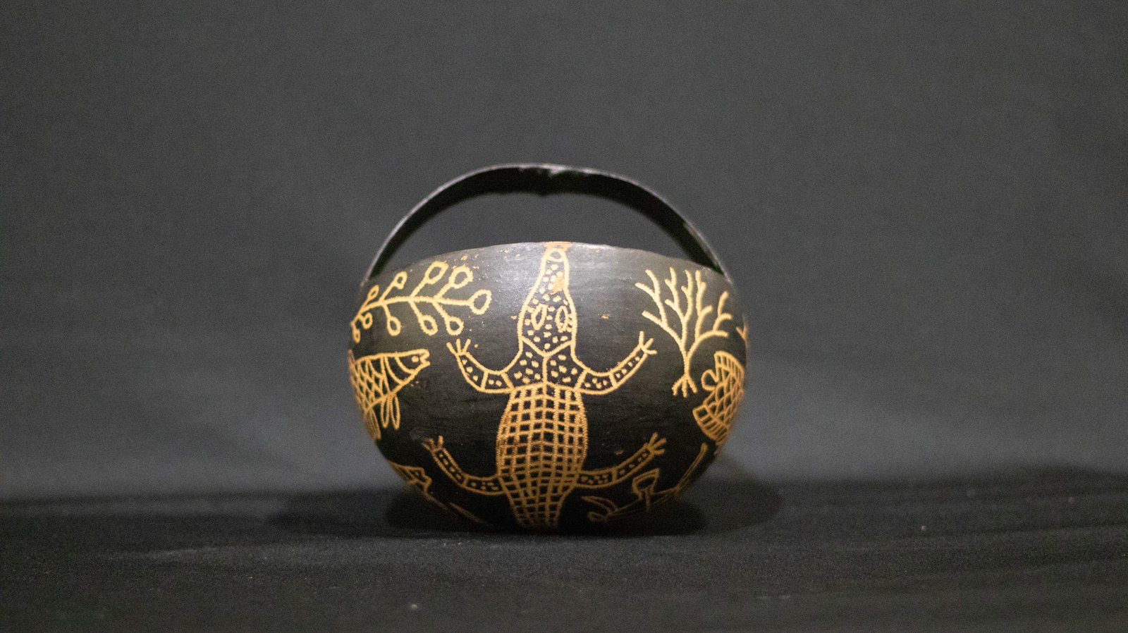 Cuia cortada no meio, raspada por dentro, pintada com tinta de kumatê (tira-se a casca de pau bate bem e põe para ferver até ficar preto e grosso, deixa esfriar e pinta a cuia) depois de pintada é colocada em cima da cinza com xixi para que ela fique bem preta e brilhosa.