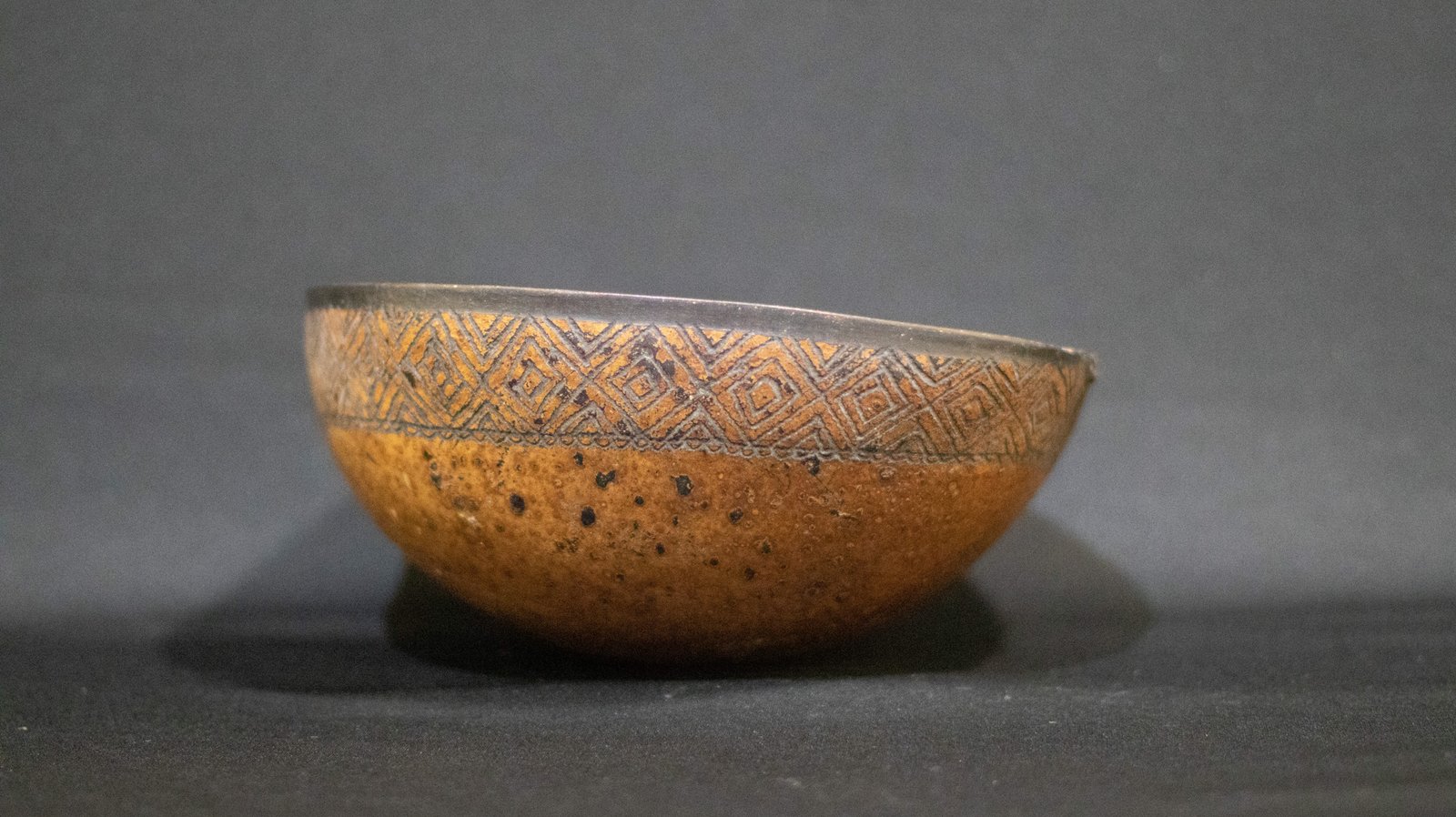 Cuia confeccionada com o fruto maduro da cuieira cortado ao meio. Apresenta parte interna tingida de preto e externa com listra preta, marca folha de açaí e dãdelo.