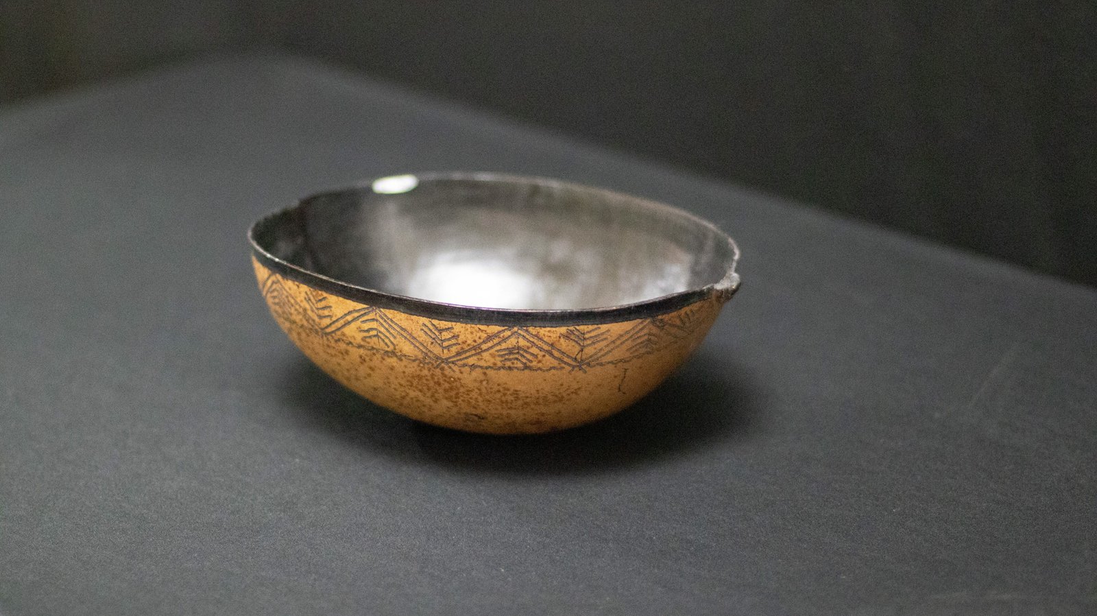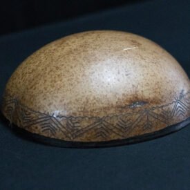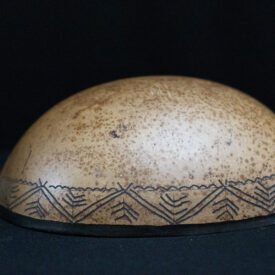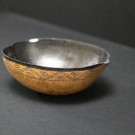 Cuia cortada no meio, raspada por dentro, pintada com tinta de kumatê (tira-se a casca de pau bate bem e põe para ferver até ficar preto e grosso, deixa esfriar e pinta a cuia) depois de pintada é colocada em cima da cinza com xixi para que ela fique bem preta e brilhosa.